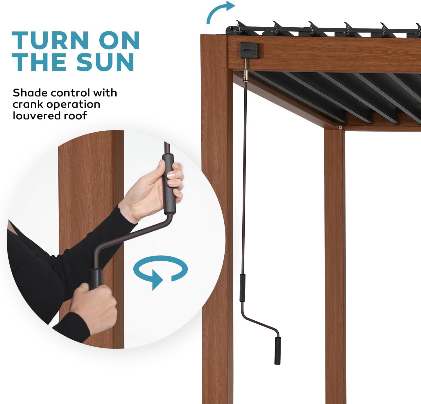 • Bioclimatic pergola with open and close louvered roof: With a user-friendly crank system, you can effortlessly adjust the louvers from 0° to 93°. Enjoy complete control over sunlight, ventilation, and shade, making your outdoor experience truly personalized.