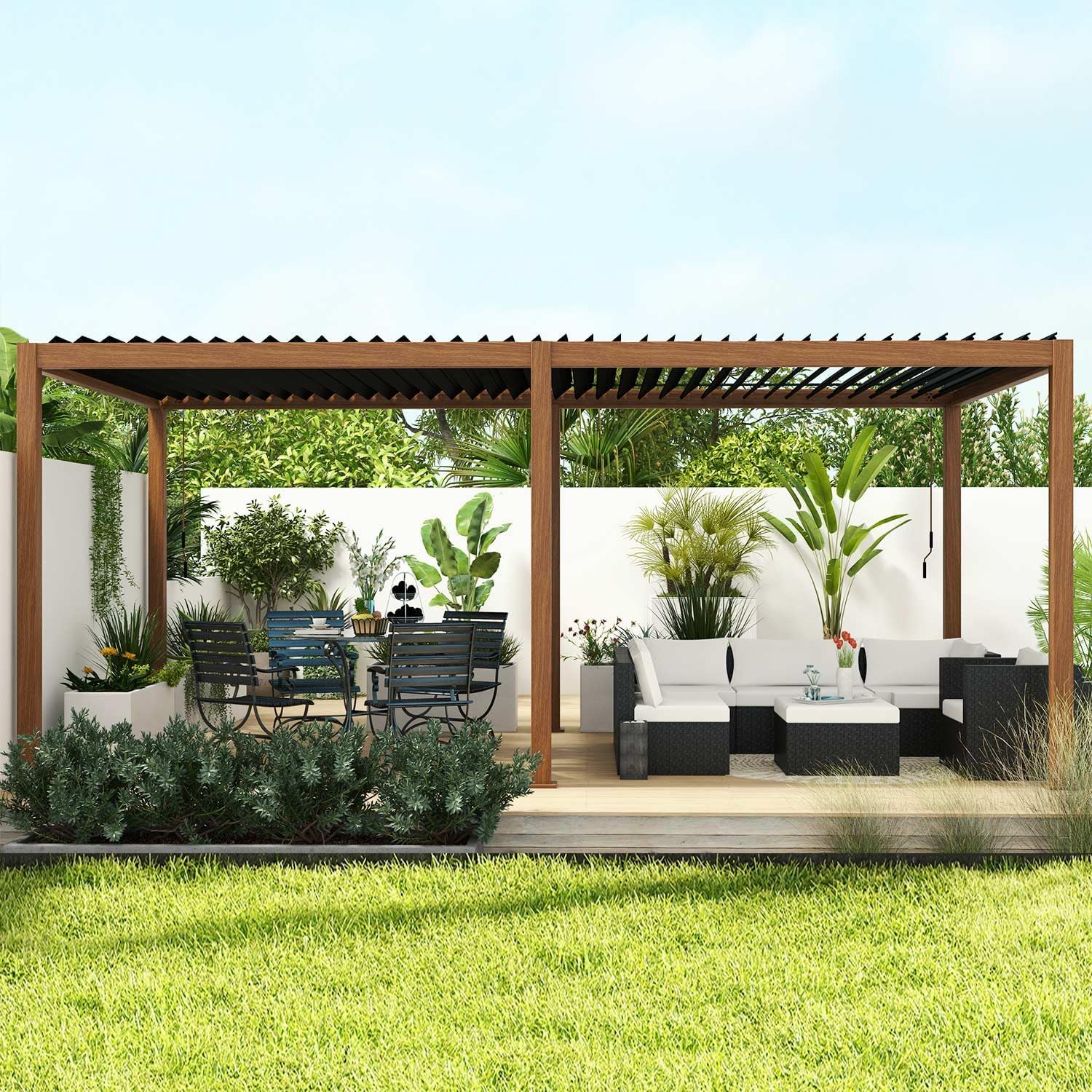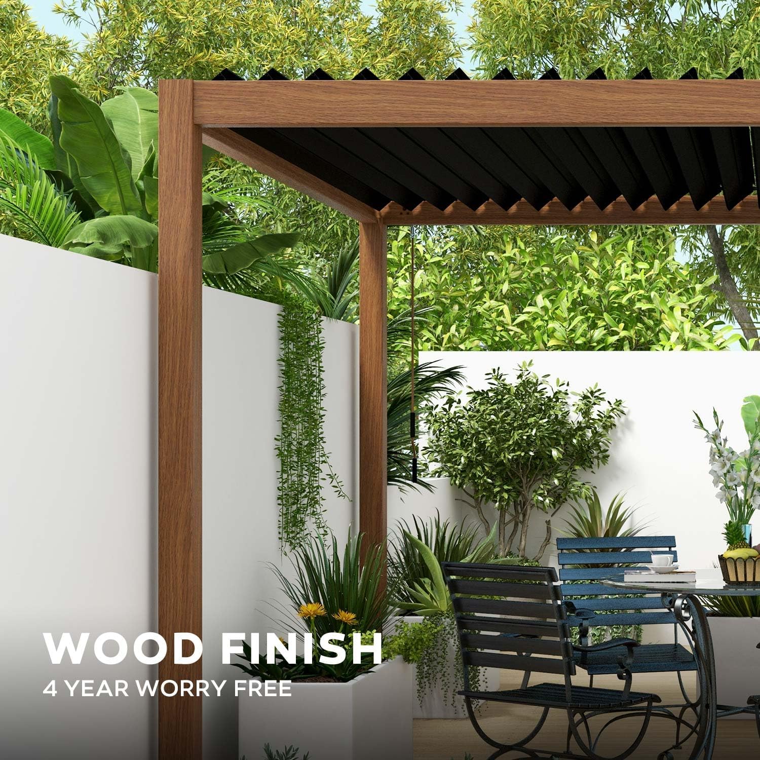 • Full aluminum frame: Crafted from premium aluminum and steel, the Mirador pergola stands the test of time and nature’s elements. Its robust construction ensures enduring durability, granting you years of enjoyment for your outdoor vision.