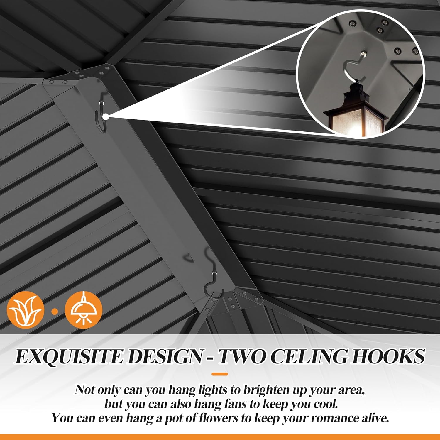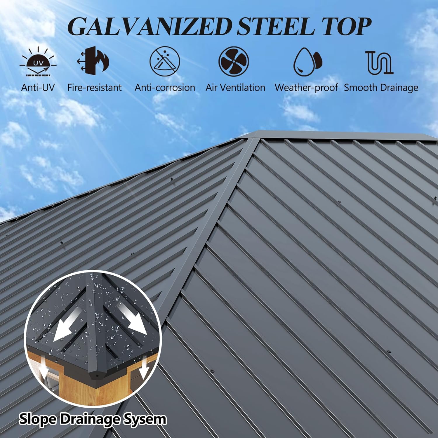 - ⛱️GALVANIZED STEEL ROOF: This galvanized steel roof lasts longer in all seasons. The metal gazebo roof is protected by a high-performance coating that resists fading and UV exposure. It is strong enough to withstand wind, rain and snow.