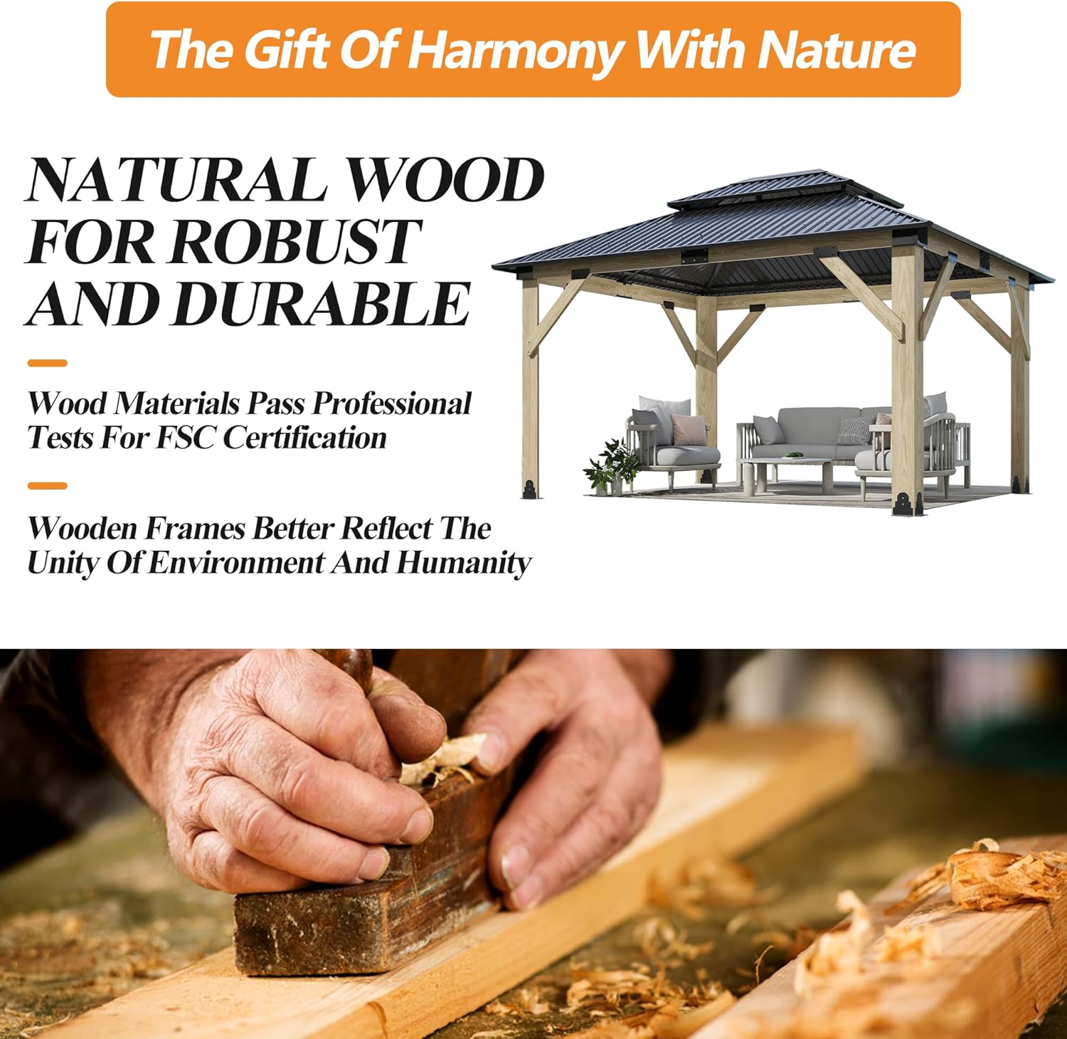 • ⛱️PREMIUM QUALITY WOOD FRAME: Our wooden gazebos are constructed with high quality wood frames that are FSC certified to ensure the patio vented roof gazebo durability and stability. Made of sturdy wood that is durable and long-lasting, providing you with a long-lasting outdoor deck wood gazebo. Besides, we maintain the ecological balance and biodiversity of our forests by complying with FSC standards. And promoting ecologically sustainable development in making this wood frame gazebo.