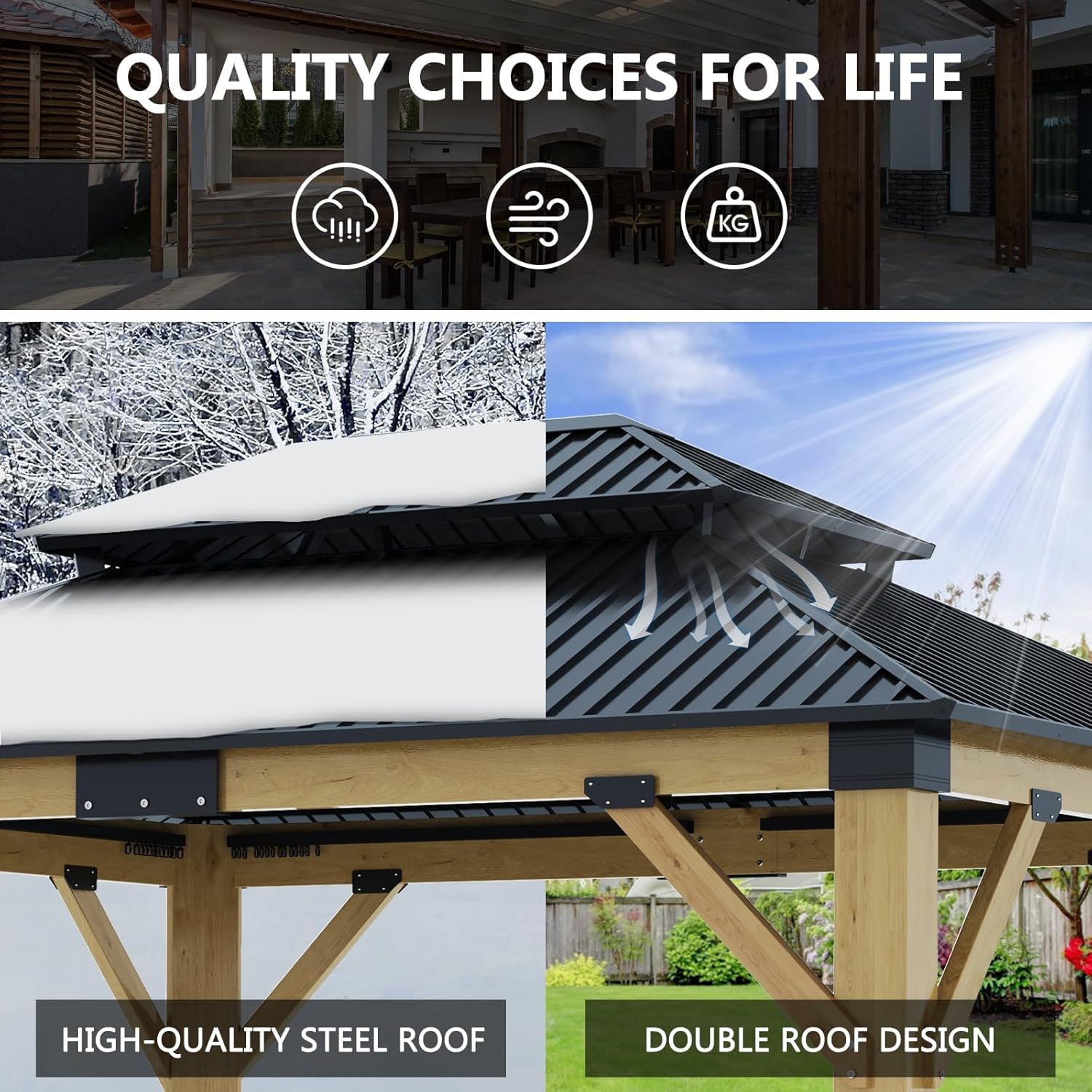 10’x12′ Wooden Hardtop Gazebo,Wood Heavy Duty Solid Cedar Gazebos with Mosquito Netting and Waterproof Curtains,Outdoor Metal Canopy for Backyard Deck Patio B0DWK3ZFSQ