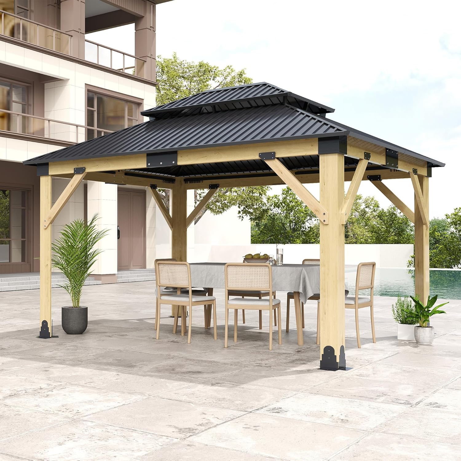 11x13FT Wood Gazebo, Outdoor Wooden Gazebo with Aluminum Double Roof, Hardtop Gazebos for Garden, Patio, Deck, Backyard B0DKF6JGJR
