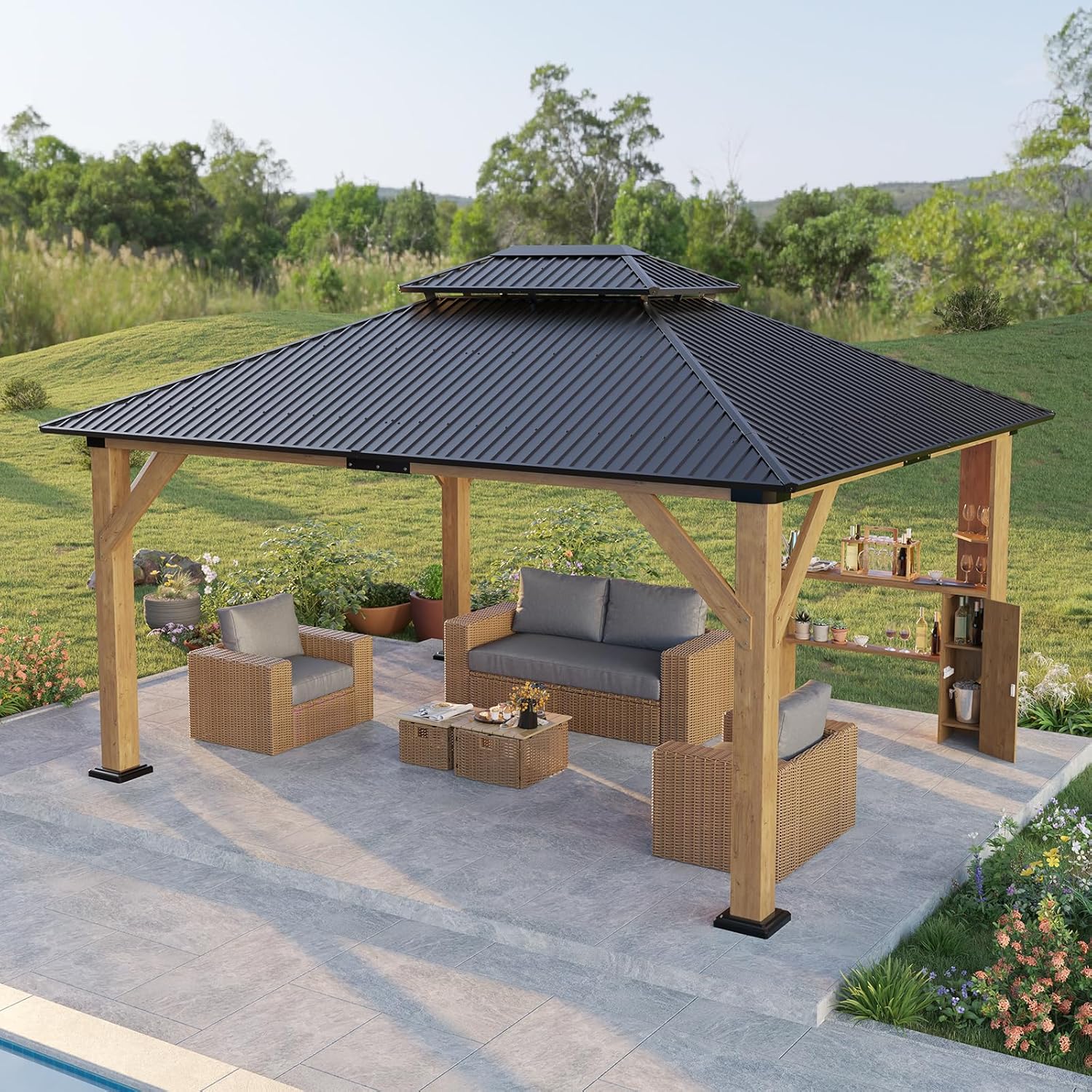 13×15 Wood Gazebo, Hardtop Outdoor Gazebo with Aluminum Double Roof, Outdoor Wooden Pavilion for Parties, Backyard, Patio, Lawns, Black + Natural Wood B0DZPCMVGF