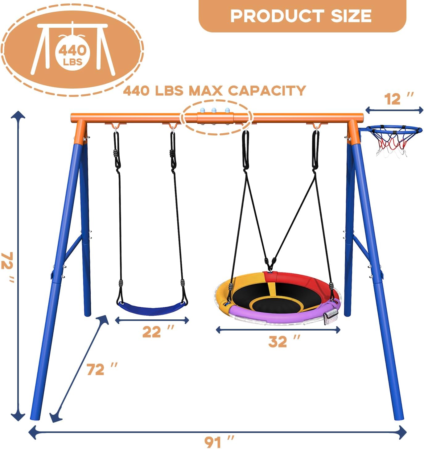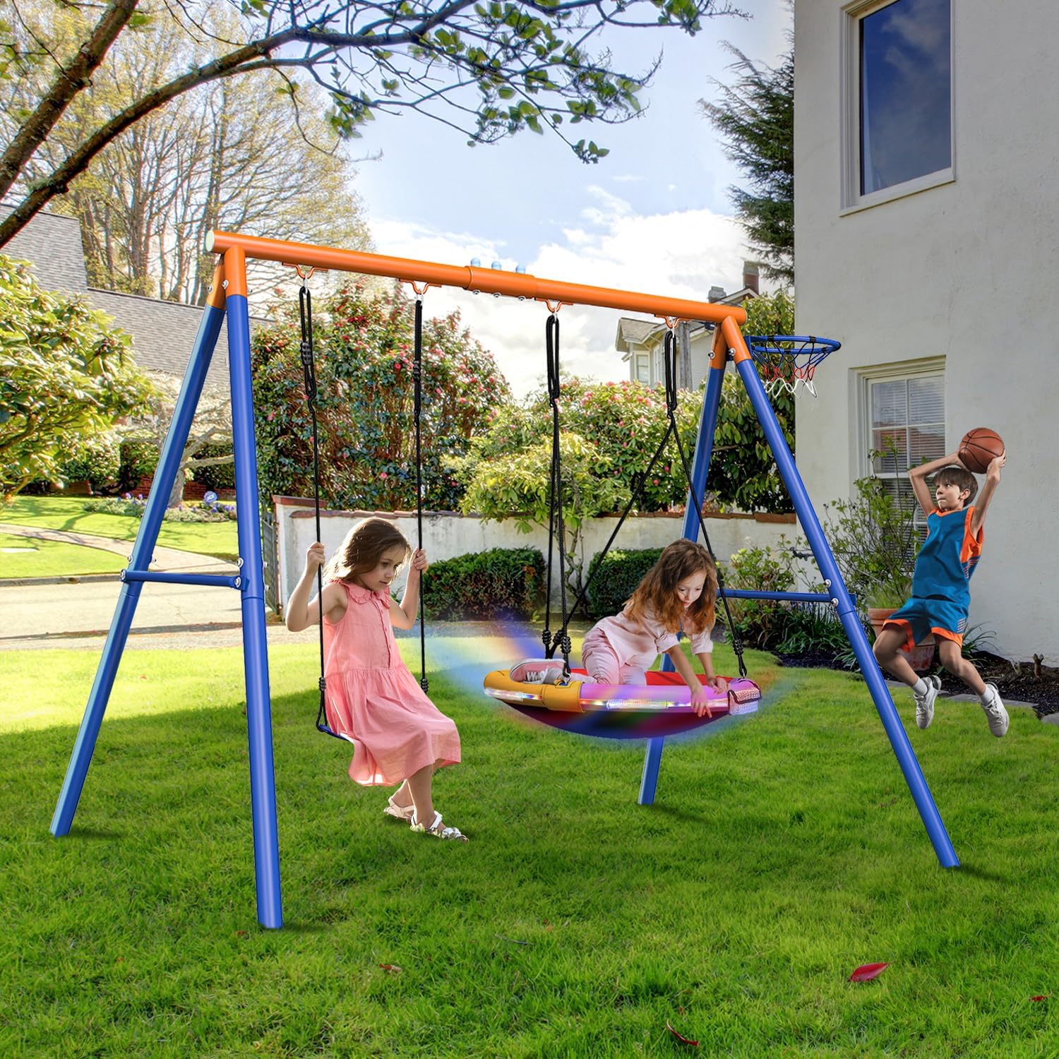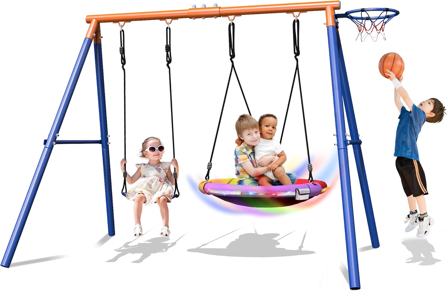 4-in-1 Swing Sets with Stand for Backyard, 440lbs Outdoor Saucer Swing Set for Kids, Heavy-Duty A-Frame Metal Playset for Playground, 32 inch Saucer, Belt Swing, Basketball Hoop, Led Light & Anchors B0D97WY6GX