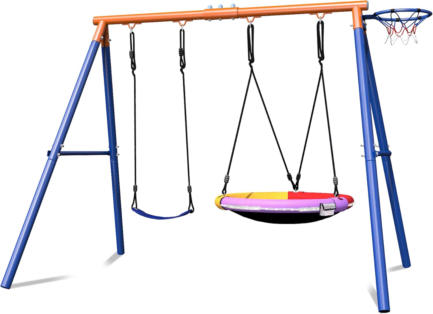 6 in 1 Multifunction Kids Swing Set for Backyard, Heavy-Duty A-Frame Metal Stand with 3 Adjustable Swing Climbing, Net, Trampoline, Basketball Hoop B0DY14XHHF
