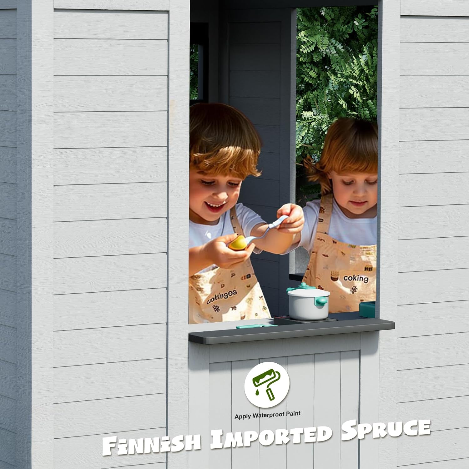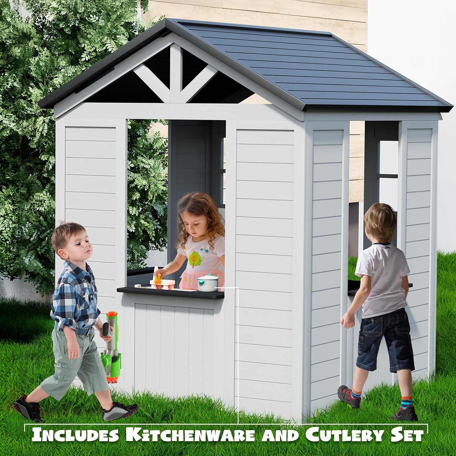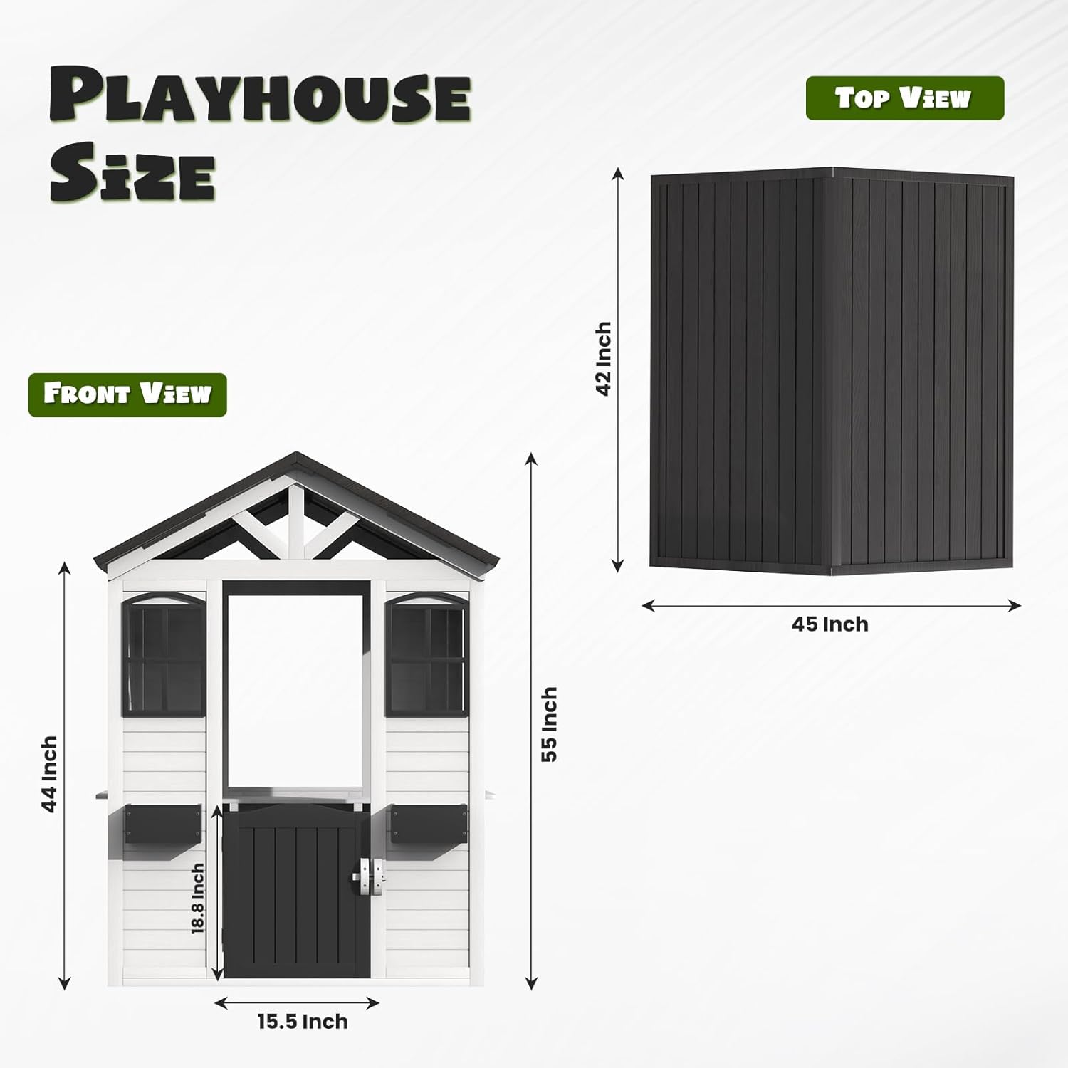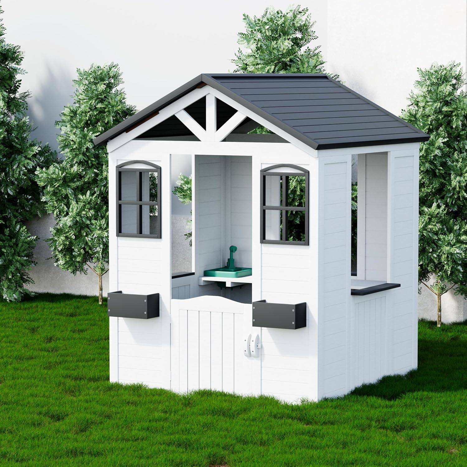 All Spruce Outdoor Kids Playhouse, Toddler Playhouse Wooden Playhouse for Kids Ages 3-10, with Sink, Stove, Flower Pot Holders, Phone, Kitchen with Food Kitchenware Tableware, 42″ x 45″ x 55″, White B0DSVMNX5L
