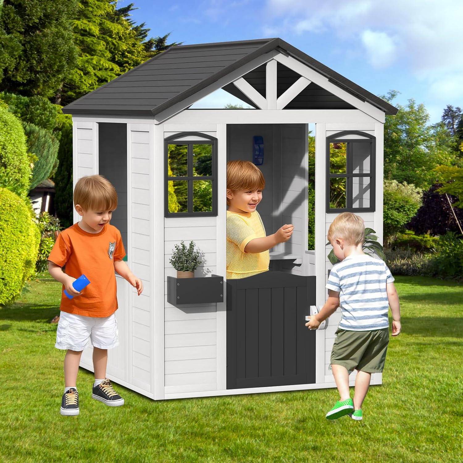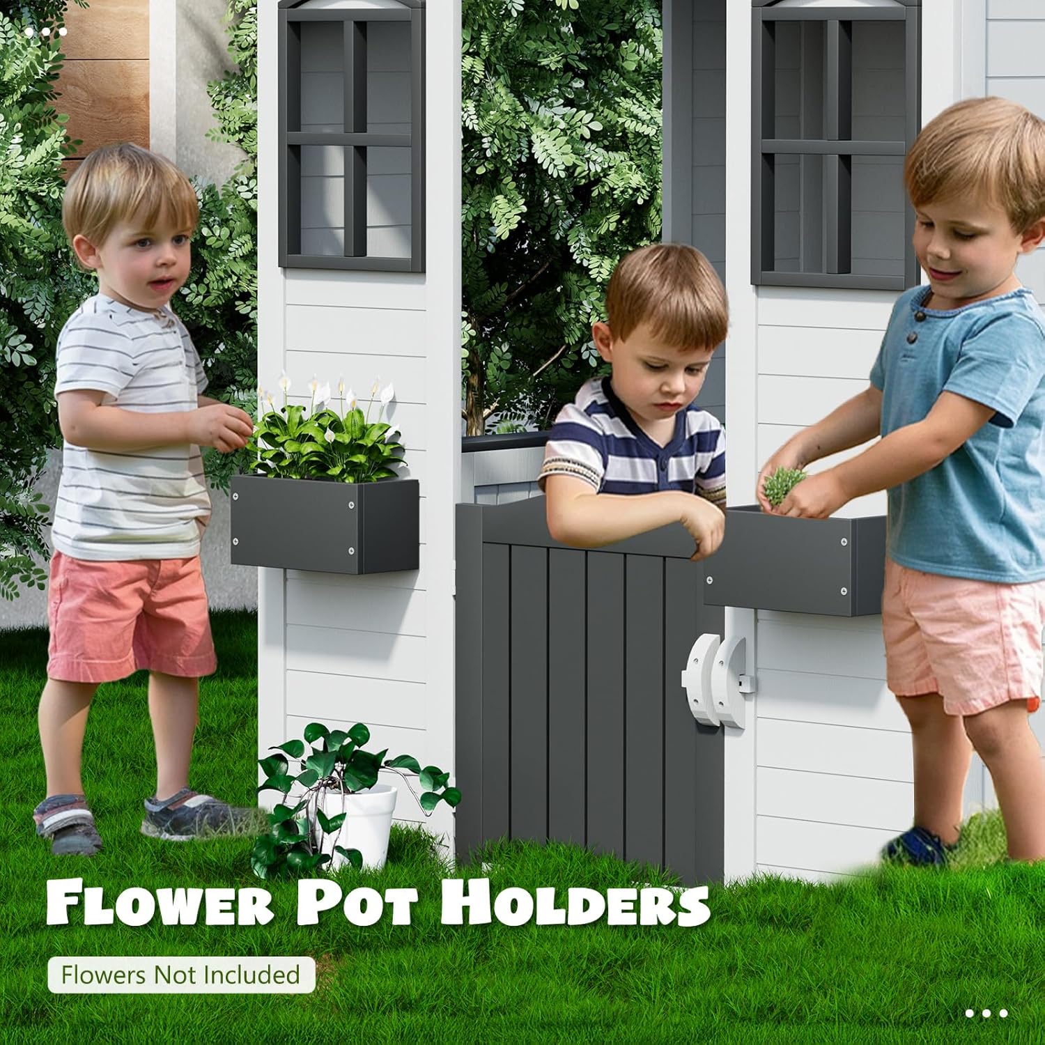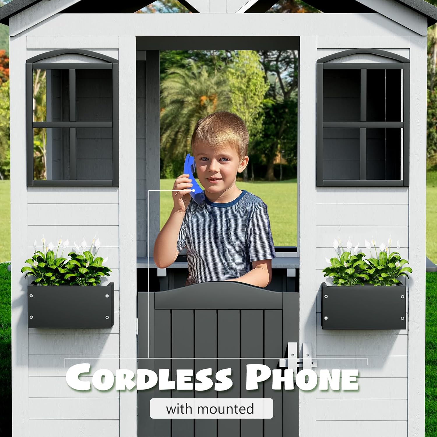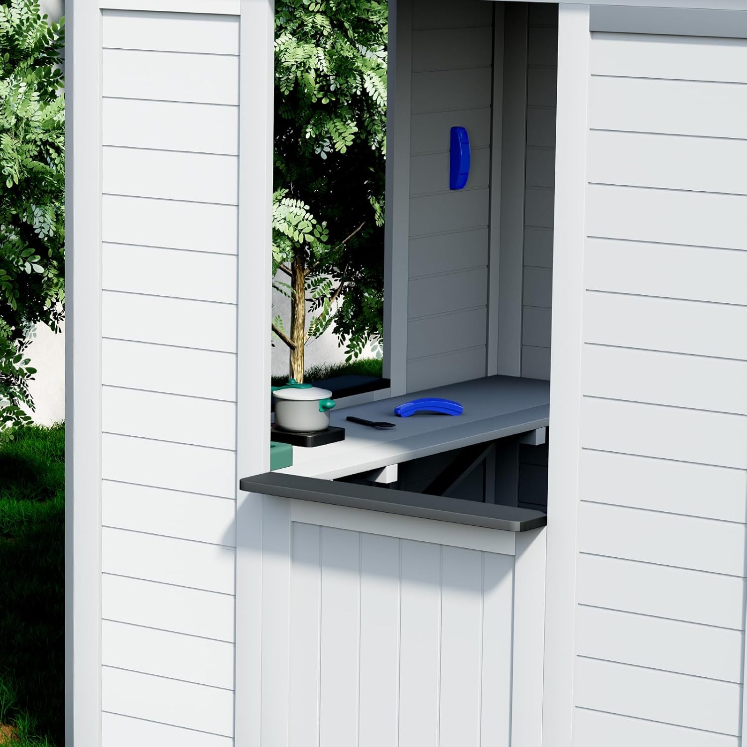 All Spruce Outdoor Kids Playhouse, Toddler Playhouse Wooden Playhouse for Kids Ages 3-10, with Sink, Stove, Flower Pot Holders, Phone, Kitchen with Food Kitchenware Tableware, 42″ x 45″ x 55″, White B0DSVMNX5L