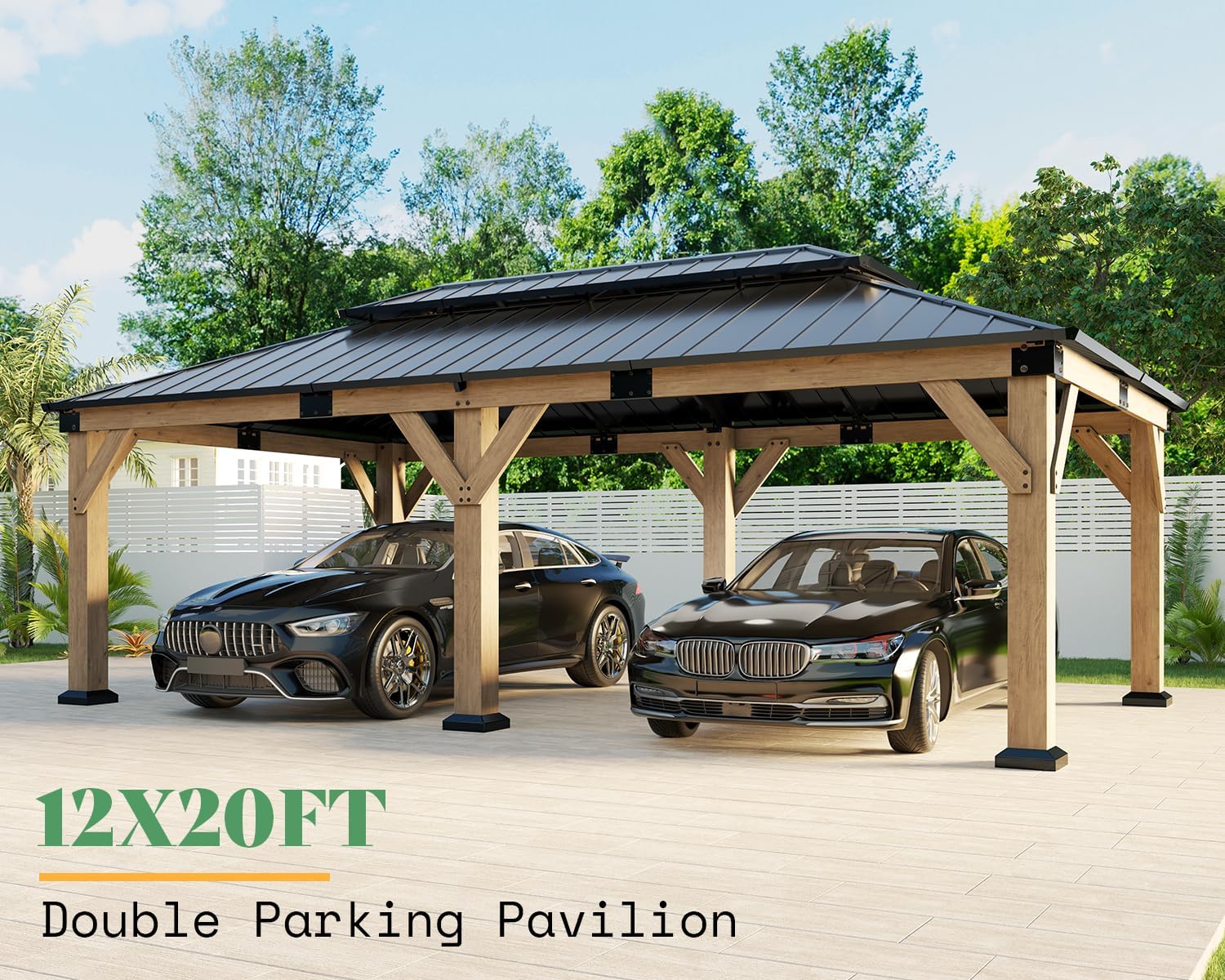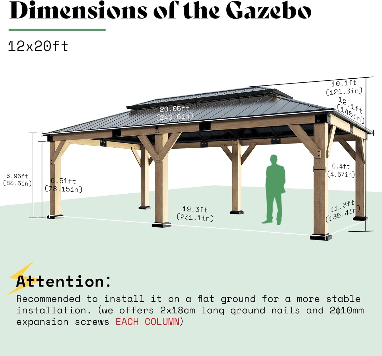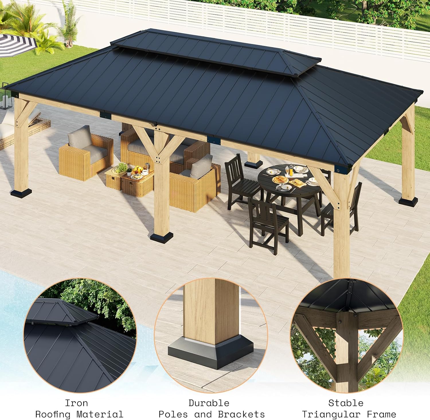 AMERLIFE 12×20 ft Hardtop Gazebo, Spruce Wood Gazebo with Iron Double Roof, Outdoor Pergola with Wood Frame for Garden, Porch, Patio, Charcoal Gray + Brown Gray B0DZNLKGYT