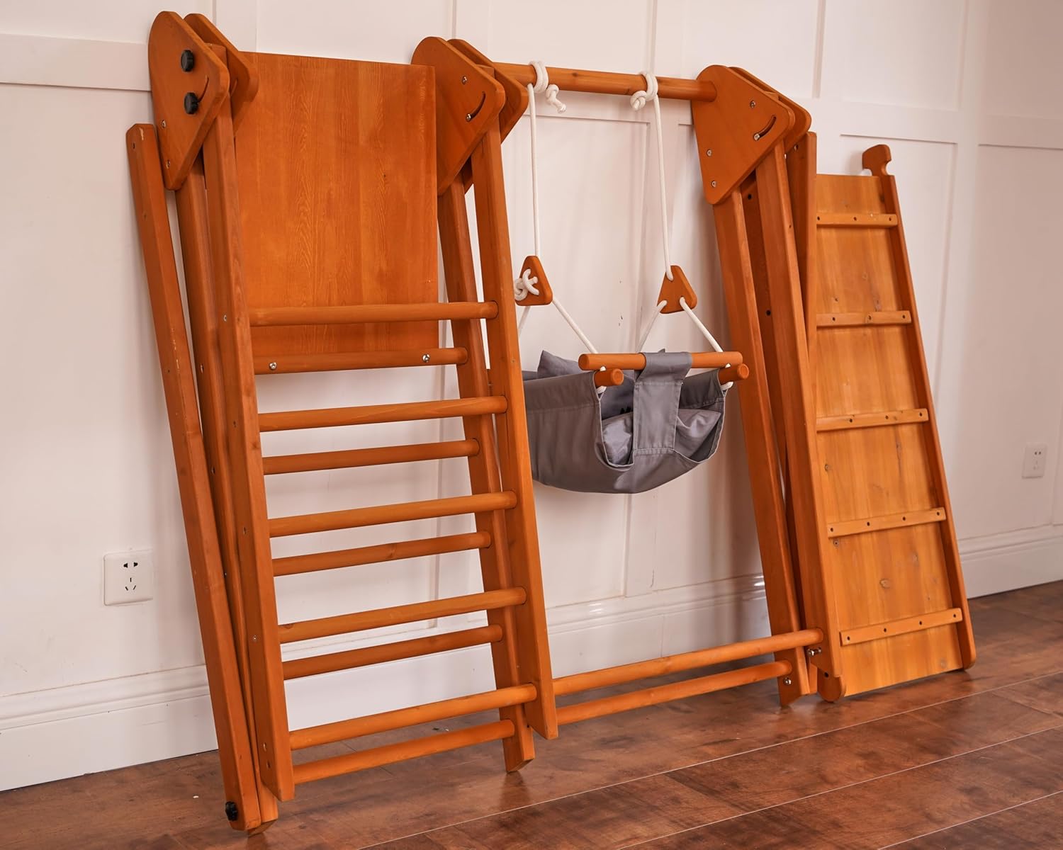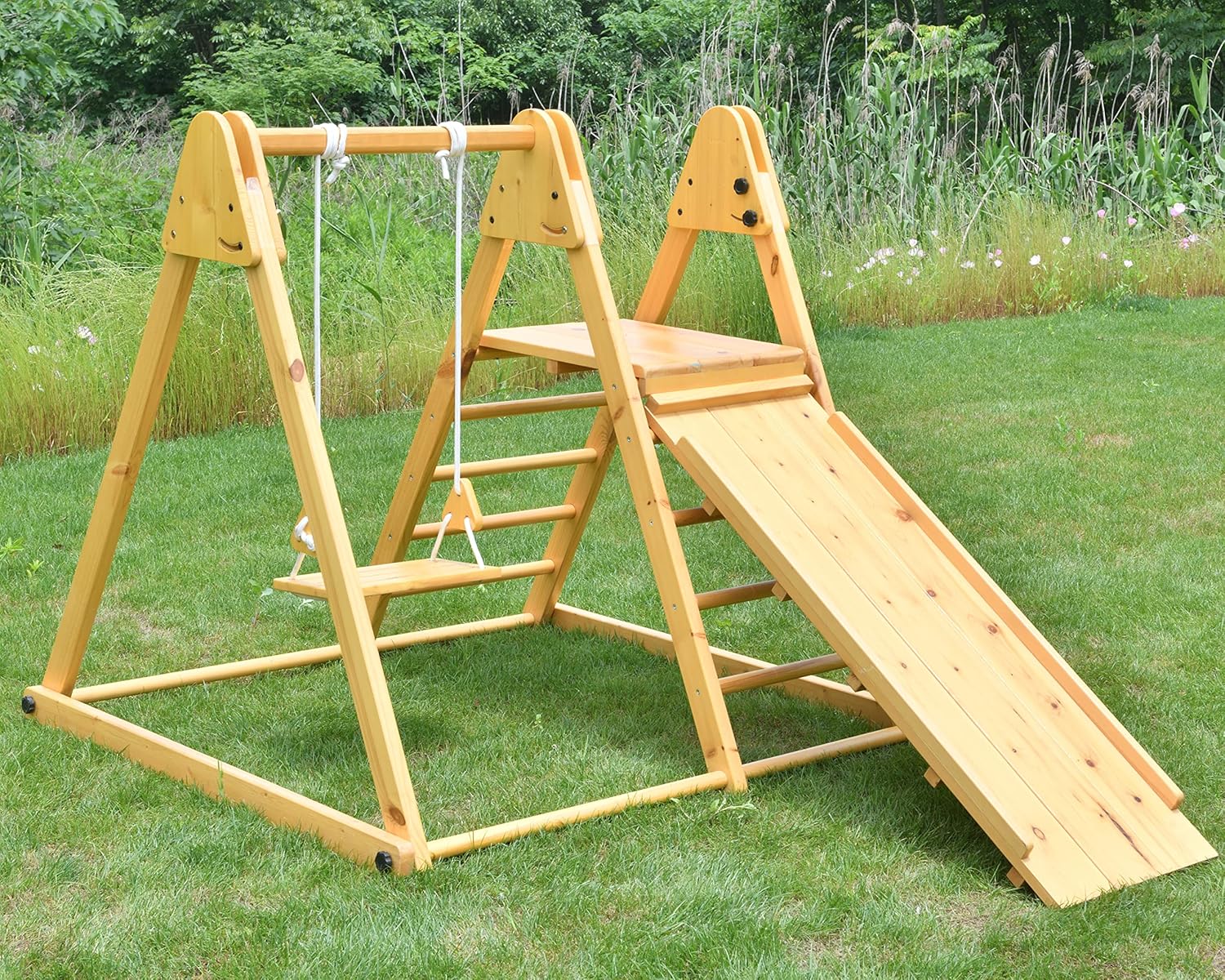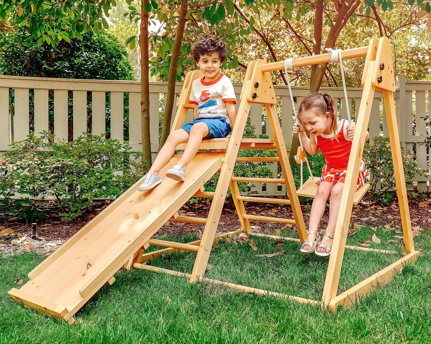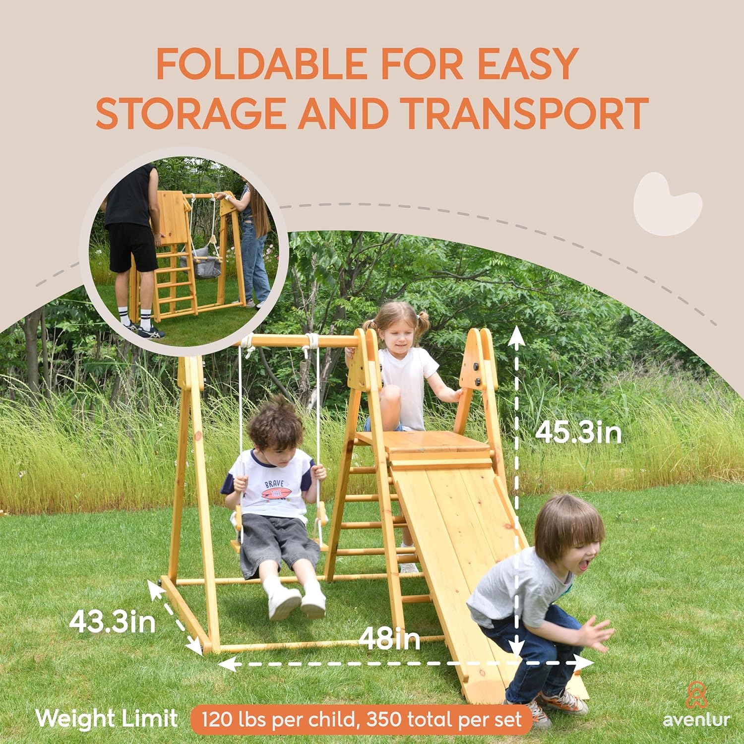 Avenlur 4-in-1 Juniper Outdoor Play Gym – Jungle Gym Playset with Baby Swing, Slide, Ladder, and Climbing Wall – Foldable Wooden Playset – Outdoor Jungle Gym for Kids Ages 18mo to 6yrs B0C3MX1FYK