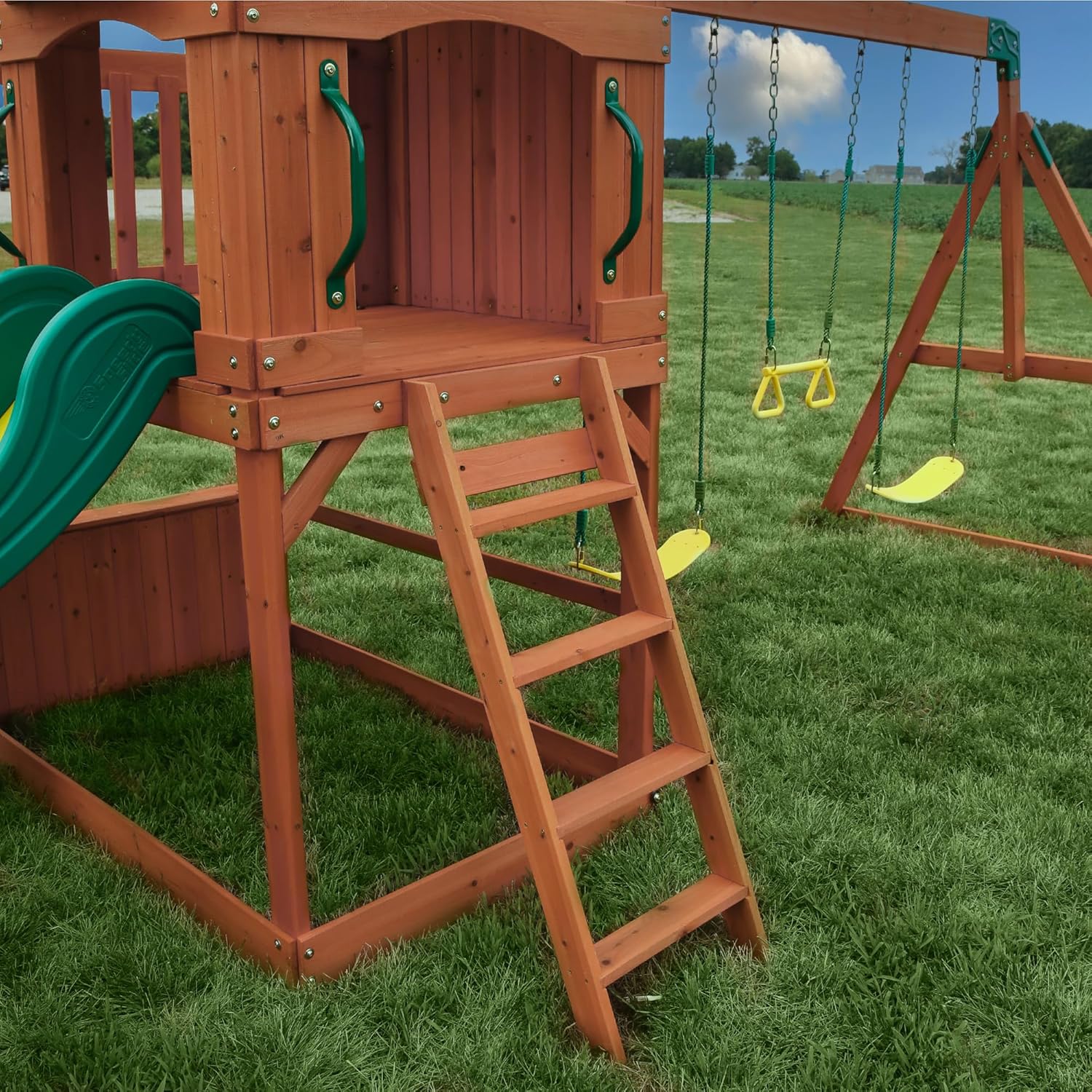 Backyard Discovery Atlantis Cedar Wood Swing Set with Wave Slide, Raised Clubhouse, Rock Wall, Belt Swings, Trapeze, Balcony, Lower Play Space, Snack Bar, Sandbox Area, Step Ladder, Outdoor Playset B073D66GQV