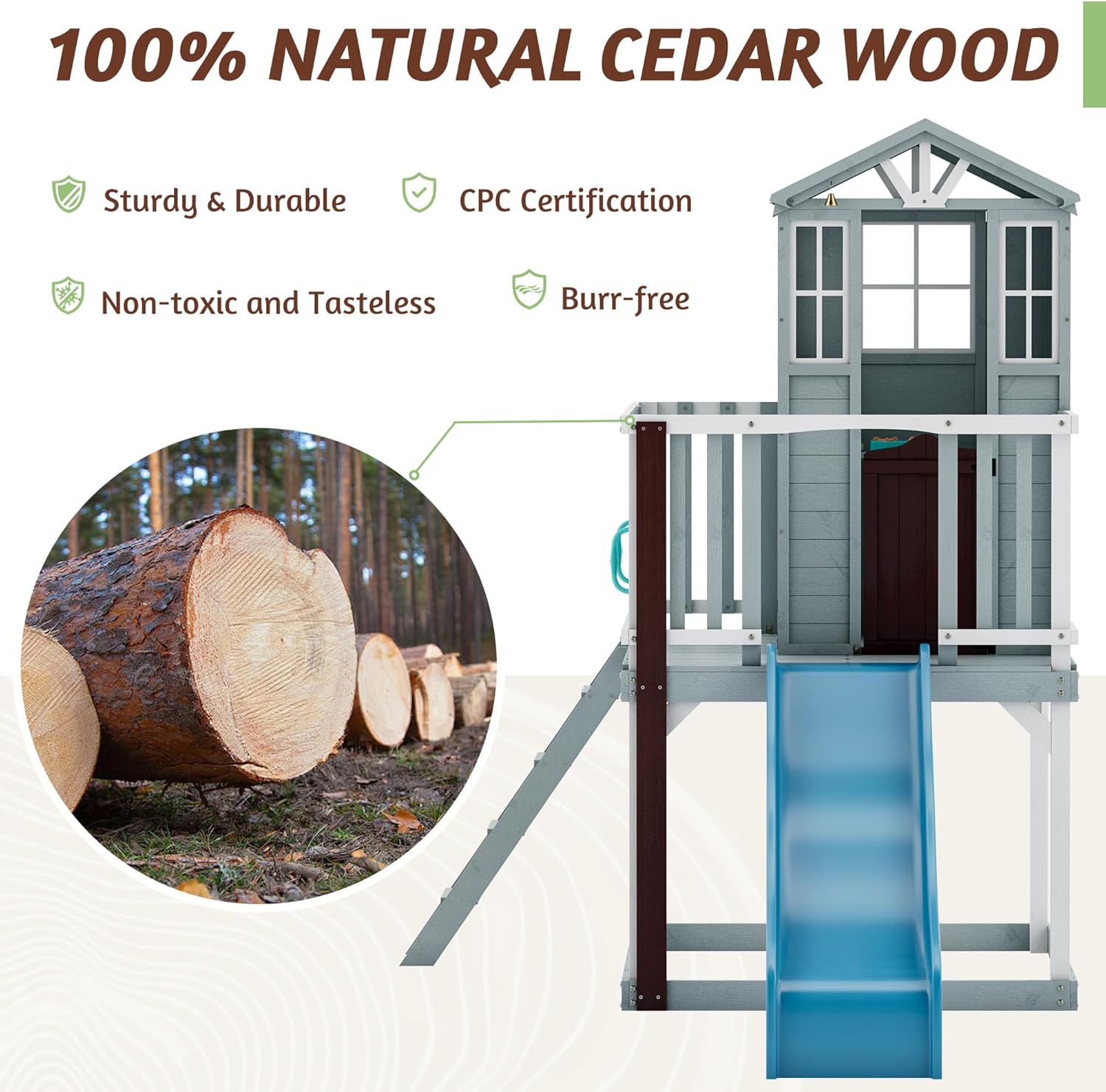 Cedar Wooden Playhouse for Kids, Outdoor Playhouse with Growth Chart,Interactive Play Kitchen,Wave Slide,Installation Manual and Videos Included,Play Houses for Toddlers 3-12 (Blue Grey) B0F32GKR2G
