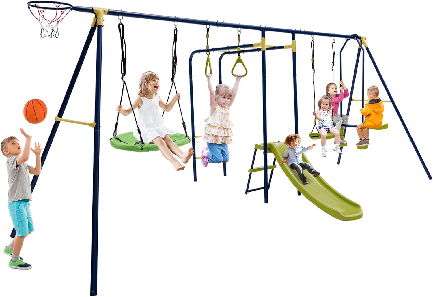 6 in 1 Multifunction Kids Swing Set for Backyard, Heavy-Duty A-Frame Metal Stand with 3 Adjustable Swing Climbing, Net, Trampoline, Basketball Hoop B0DY14XHHF