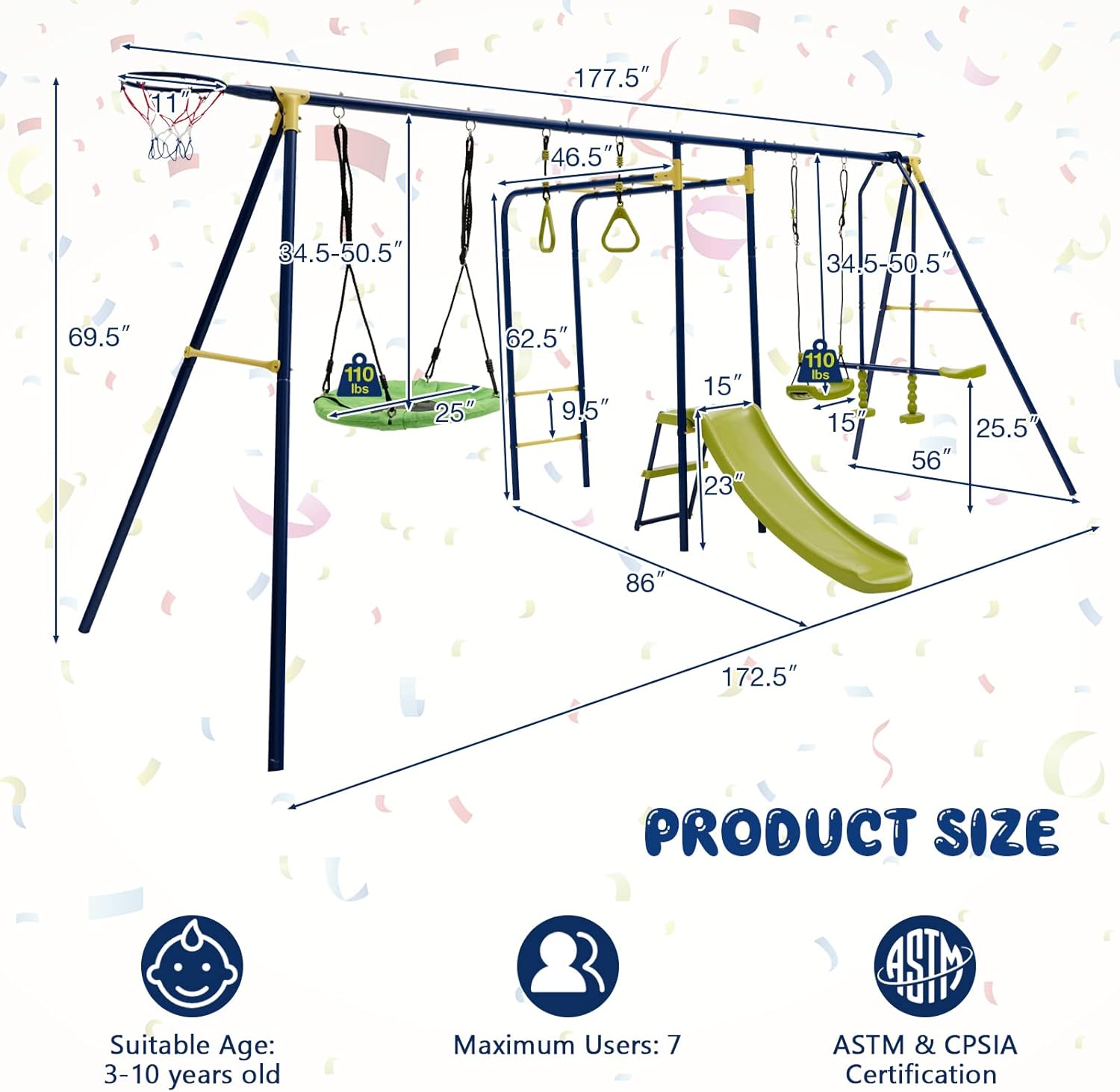 Costzon 660 lbs Swing Sets for Backyard, 7-in-1 Heavy Duty Extra Large Metal Swing Frame w/2 Swings, Glider, Gym Rings, Slide, Monkey Bar, Basketball Hoop, Play Equipment for Indoor Outdoor B0BPMHYP8Z