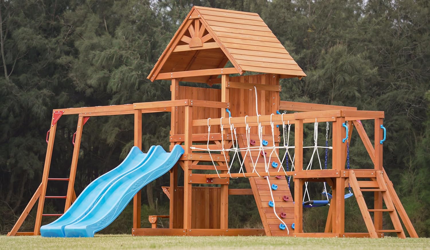 Atlantis Cedar Wood Swing Set with Wave Slide, Raised Clubhouse, Rock Wall, Belt Swings, Trapeze, Balcony, Lower Play Space, Snack Bar, Sandbox Area, Step Ladder, Outdoor Playset B073D66GQV