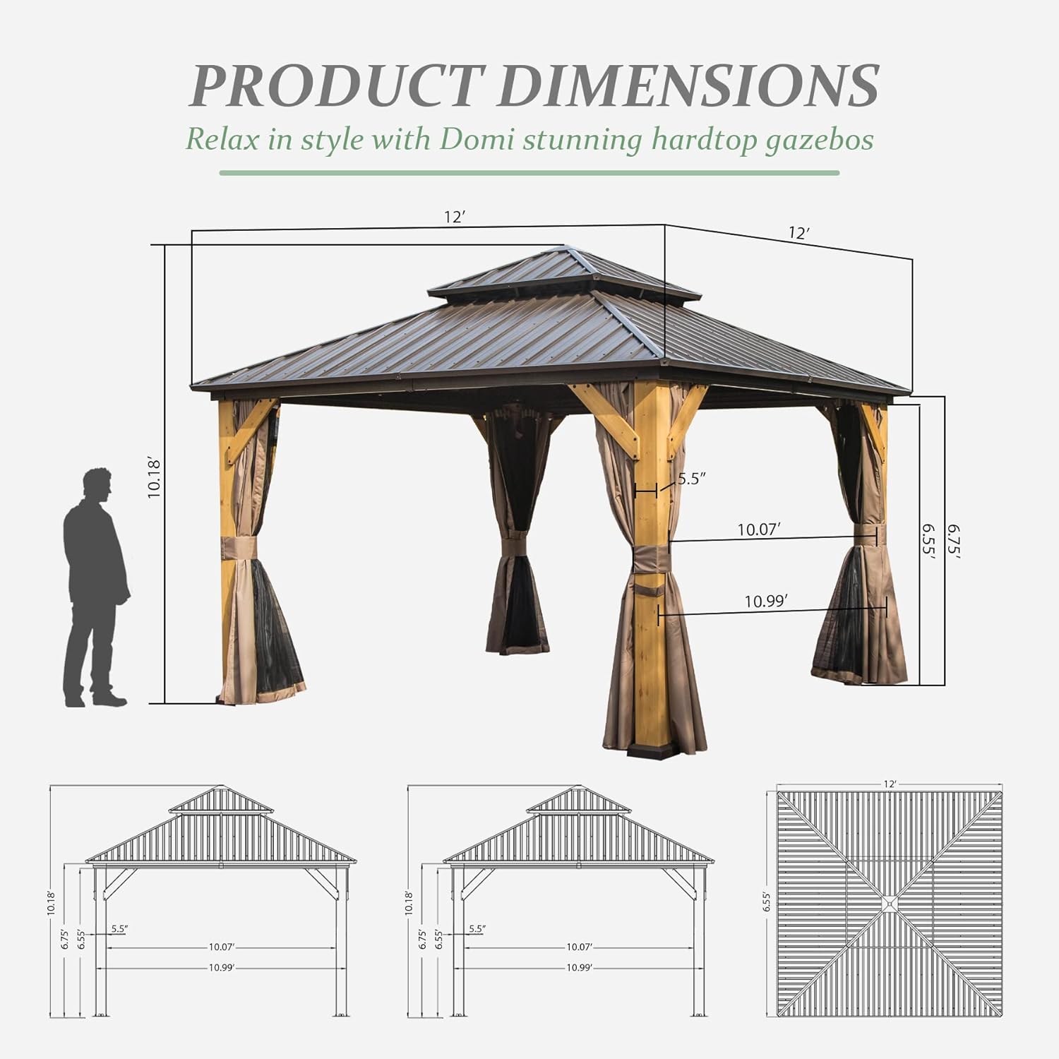 Domi 12′ X 12′ Wood Gazebo, Cedar Frame Hardtop Gazebo with Galvanized Steel Double Roof, Netting & Curtains, Patio Pergola Pavilion for Patio, Backyard, Deck, Lawns B0C3XKPP4W