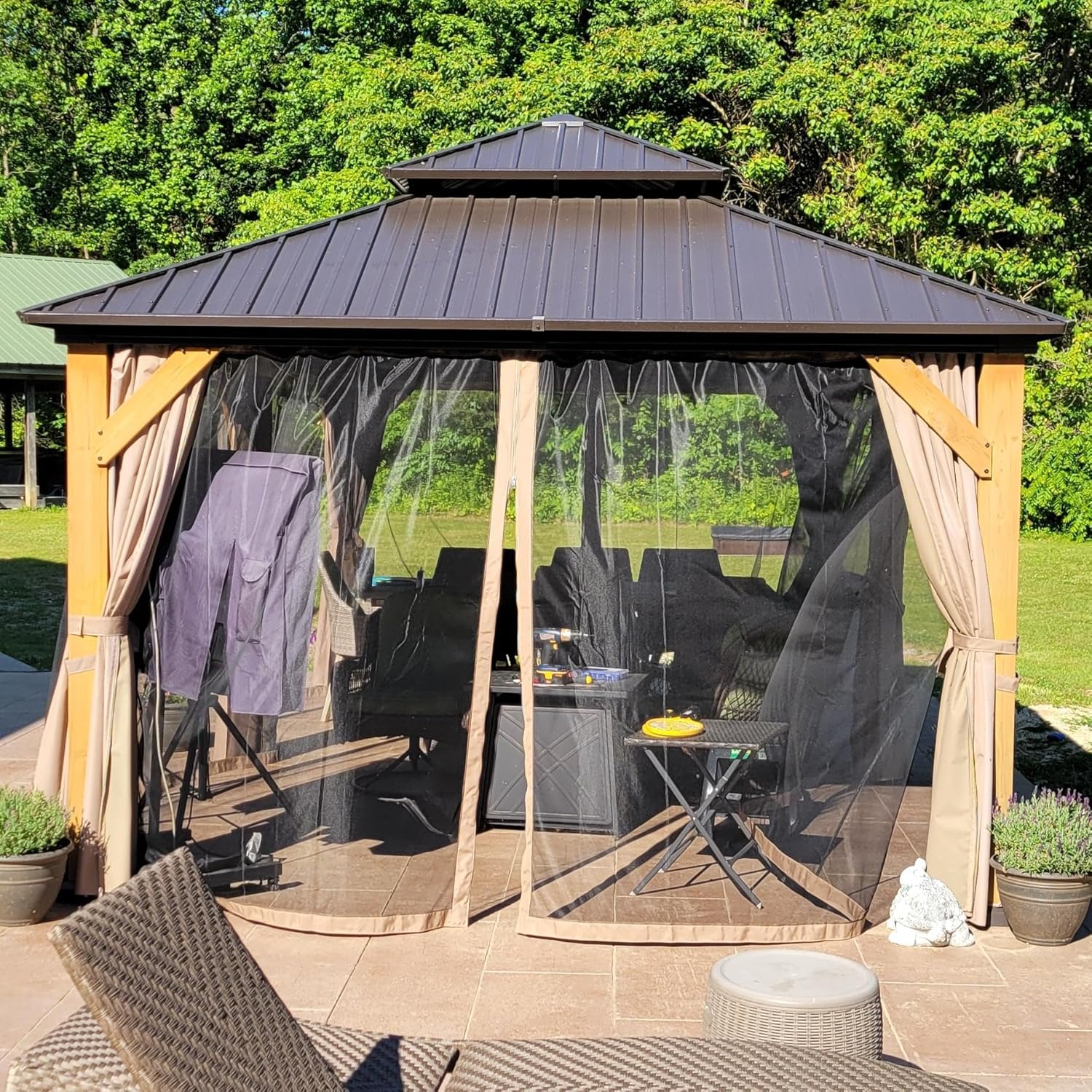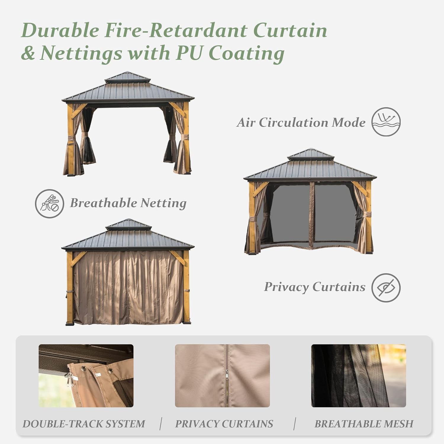 10’x12′ Wooden Hardtop Gazebo,Wood Heavy Duty Solid Cedar Gazebos with Mosquito Netting and Waterproof Curtains,Outdoor Metal Canopy for Backyard Deck Patio B0DWK3ZFSQ