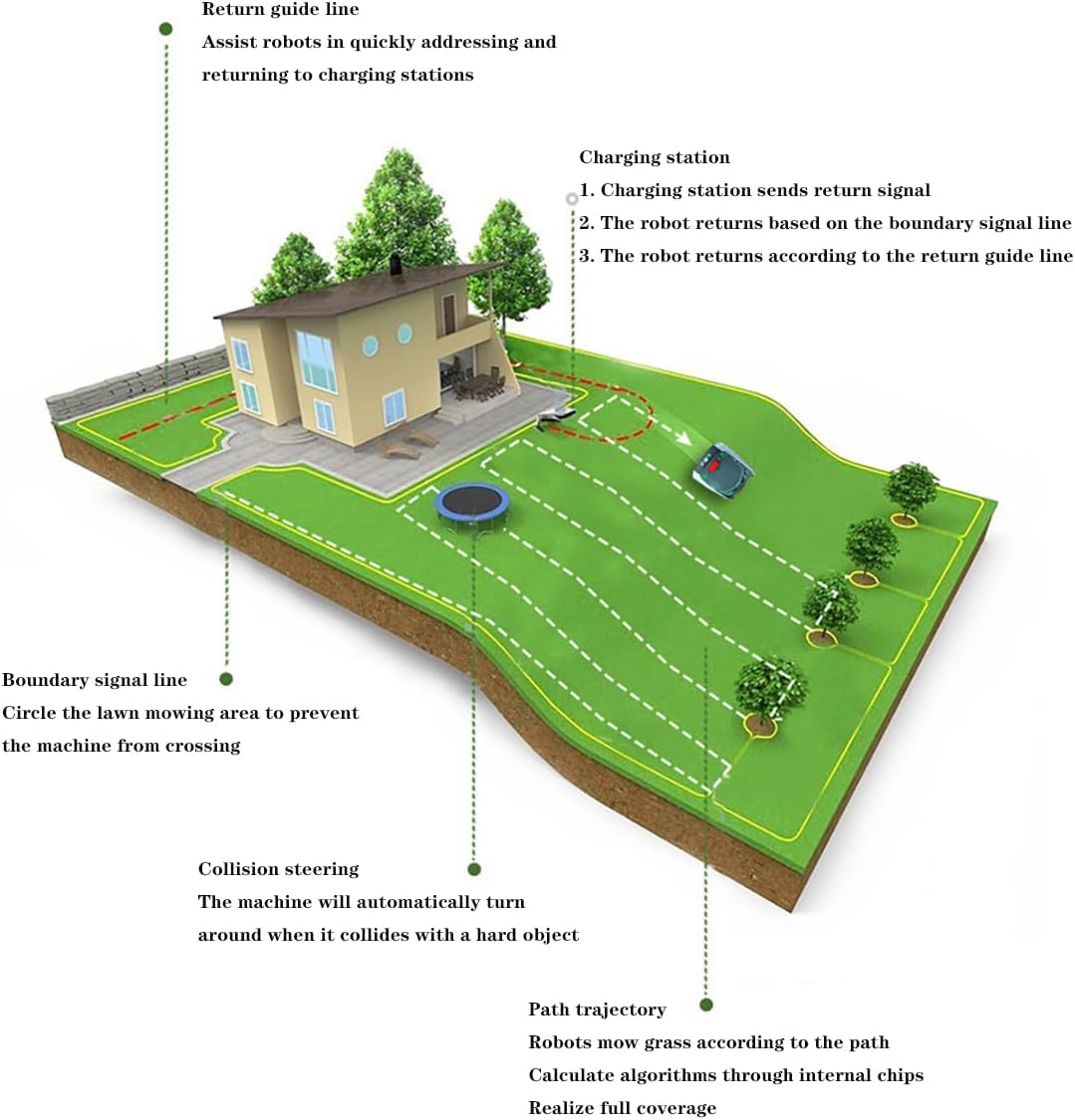 • 5: Path trajectory: The robot cuts grass according to the path and achieves full coverage through internal chip calculation algorithms.