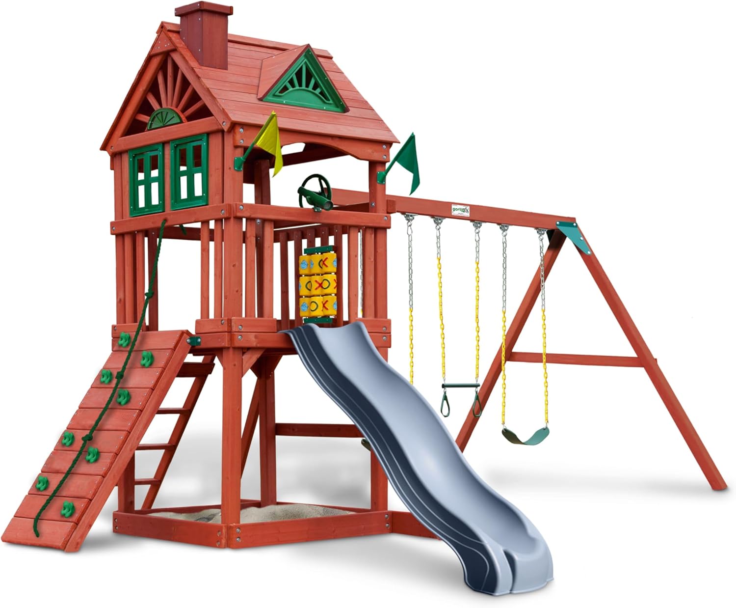 Gorilla Playsets 01-0021-GREY Nantucket II Wood Swing Set with Wood Roof, Two Swings, Grey Slide, Sandbox Area, Rock Wall, Redwood Color B0CX6HGQCJ
