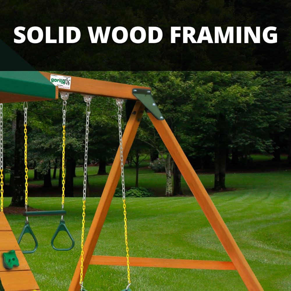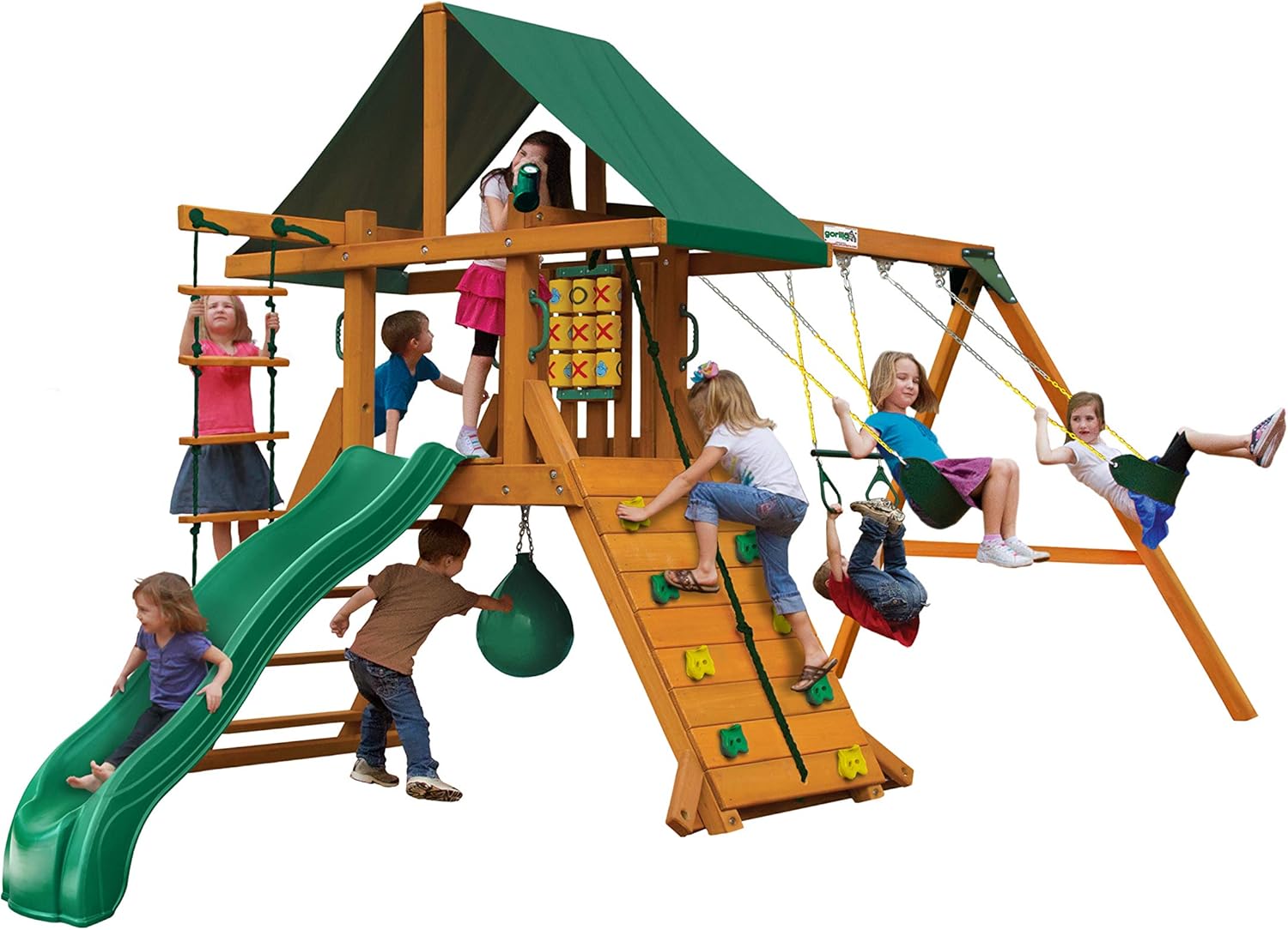 Gorilla Playsets 01-1033 Ozark II Wood Swing Set with Green Vinyl Canopy, Rock Wall, and Punching Ball B08S24DJMS