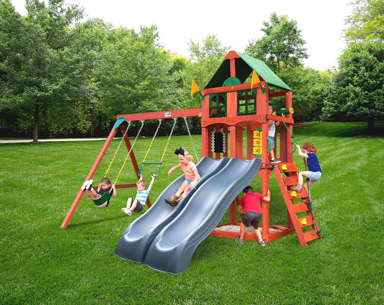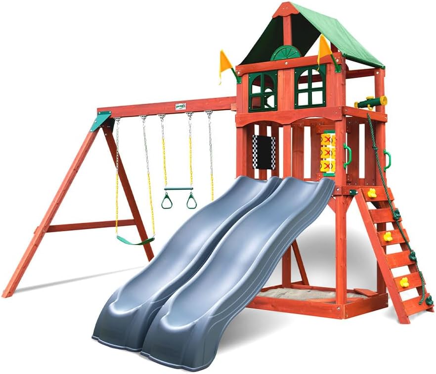 Gorilla Playsets 01-1057-GREY Playmaker Deluxe Wooden Swing Set with Dual Gray Wave Slides, Vinyl Canopy Roof, Swings, and Rock Climbing Wall, Redwood Stained Cedar (Amazon Exclusive) B0CLF53BQY