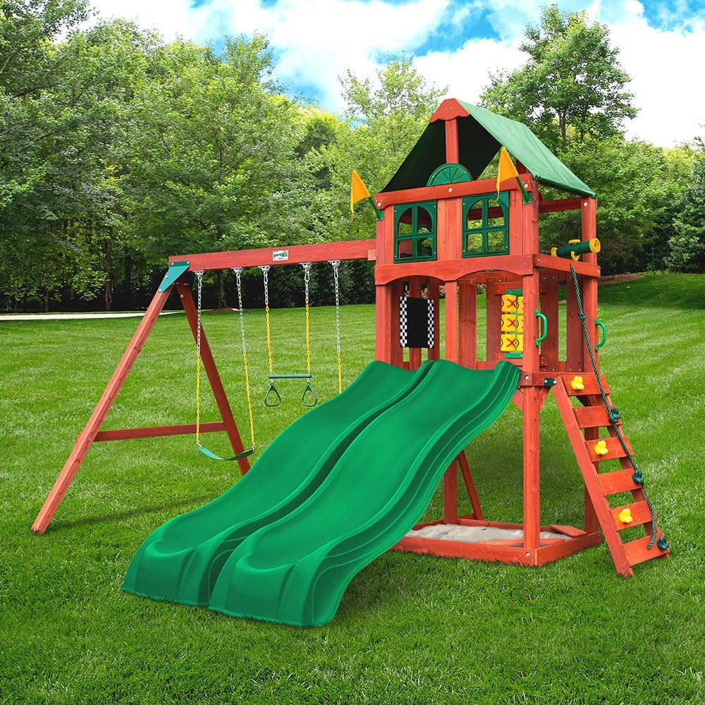 Gorilla Playsets 01-1057 Playmaker Deluxe Wooden Swing Set with Vinyl Canopy Roof, Dual Wave Slides, and Rock Climbing Wall, Redwood Stained Cedar B08S26XTYV