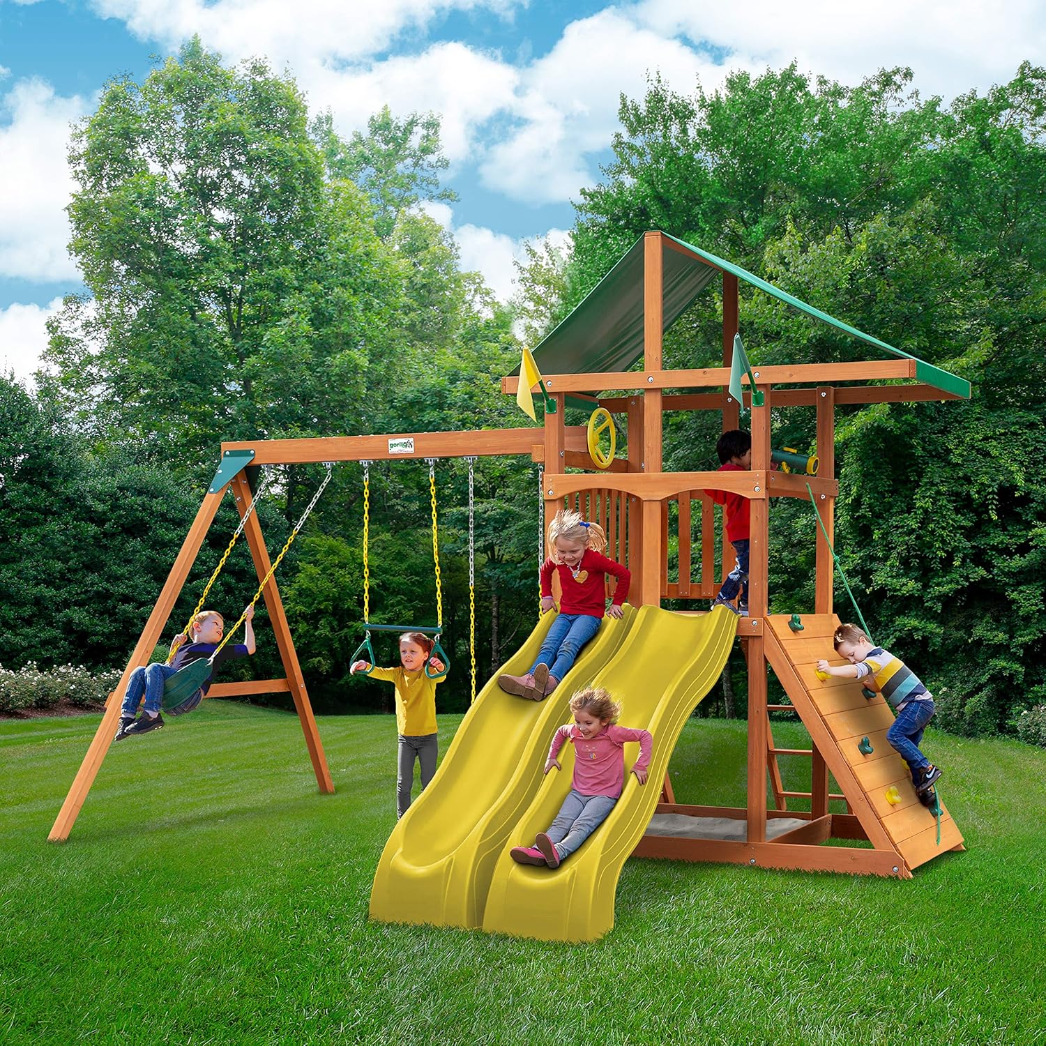 Gorilla Playsets 01-1070-Y Outing Wood Swing Set with Green Vinyl Canopy and Yellow Dual Alpine Slides, Natural Cedar B08HVS6DWM