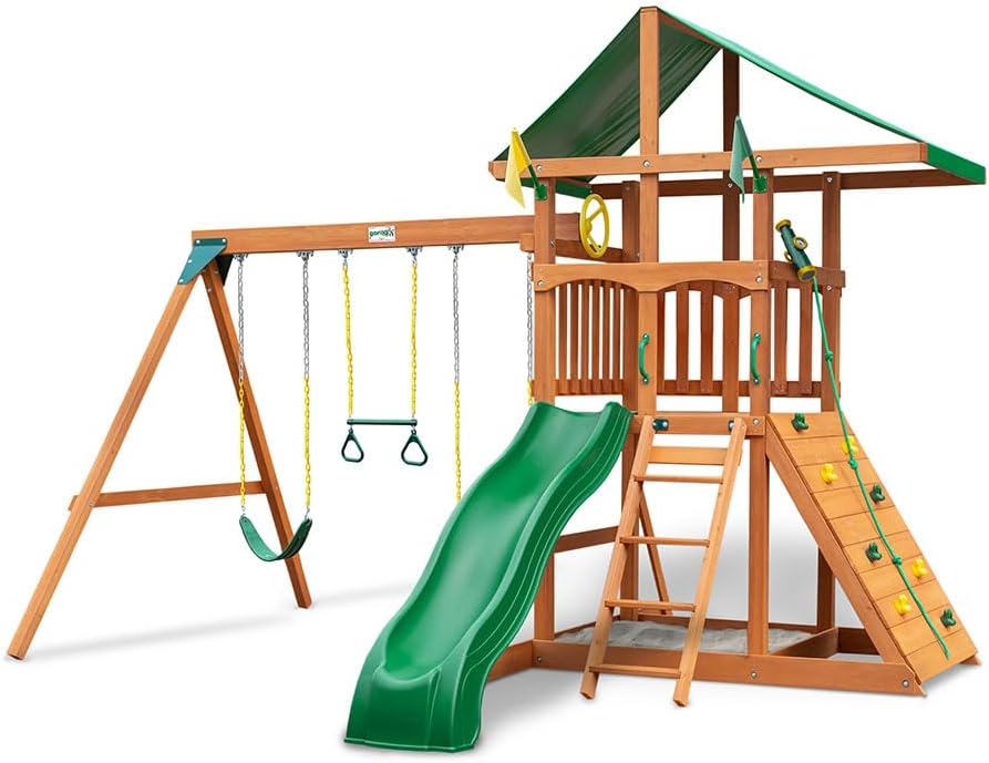 Gorilla Playsets 01-1076 Avalon Wooden Swing Set with Oversized Green Vinyl Canopy Roof, Climbing Wall, Ladder, Swings and Slide B09QB4FJ7W