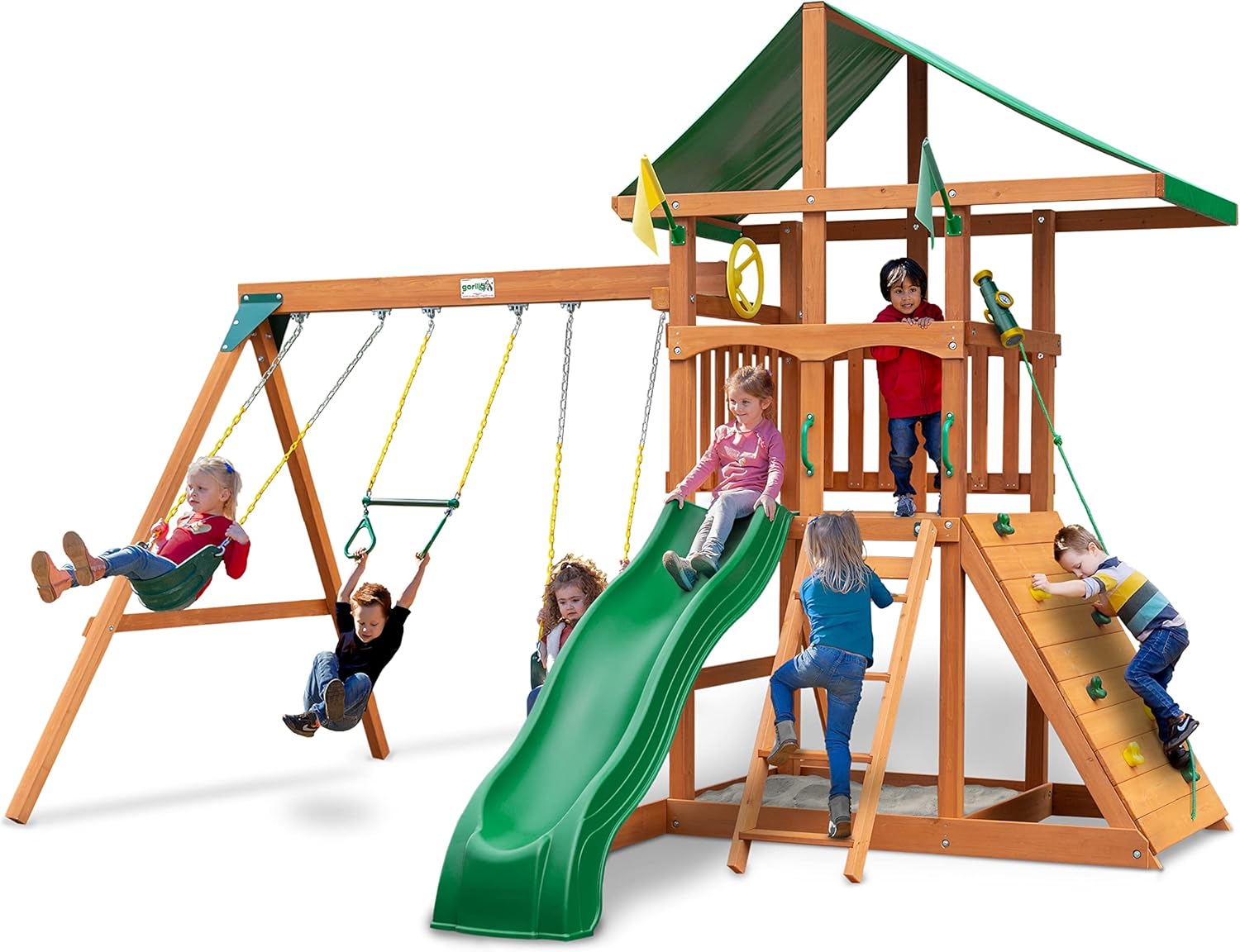 Gorilla Playsets 01-1076 Avalon Wooden Swing Set with Oversized Green Vinyl Canopy Roof, Climbing Wall, Ladder, Swings and Slide B09QB4FJ7W