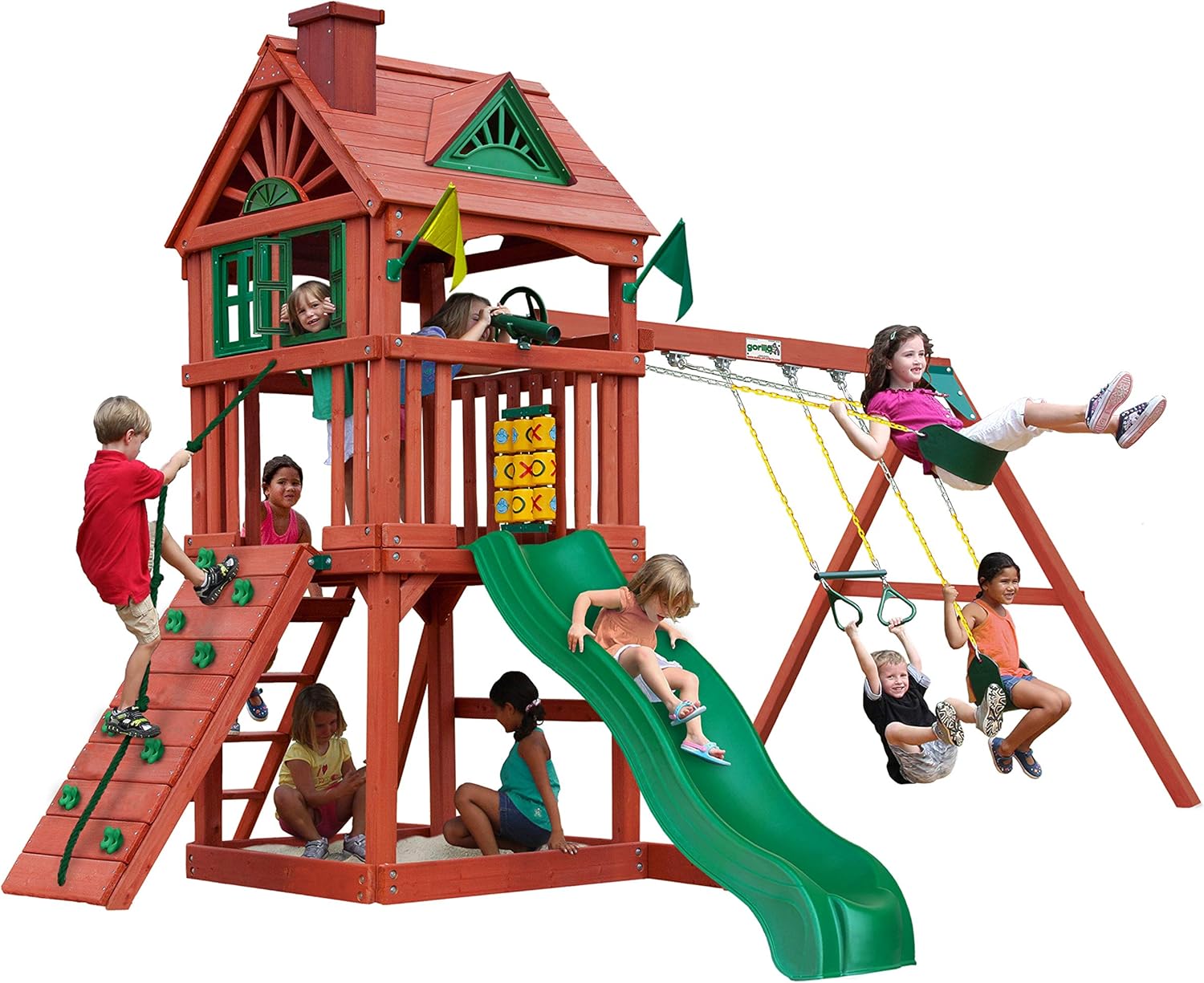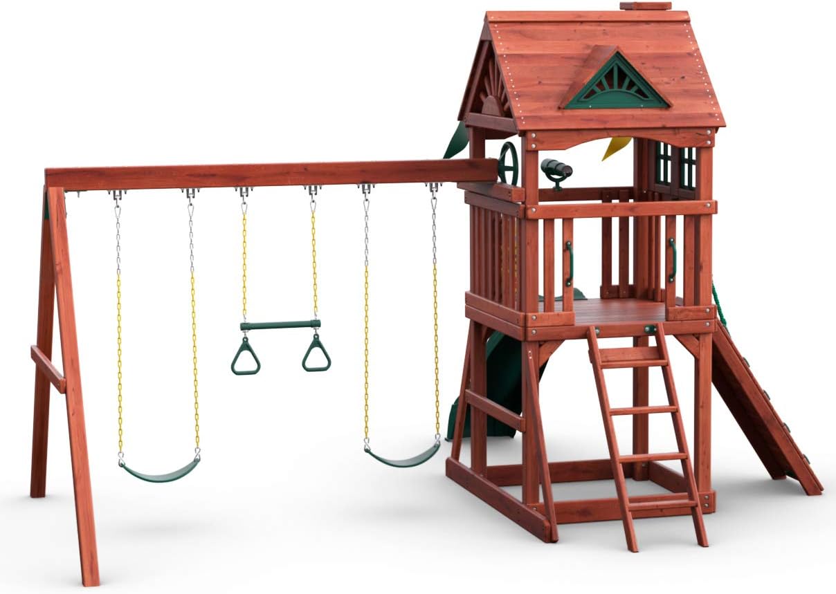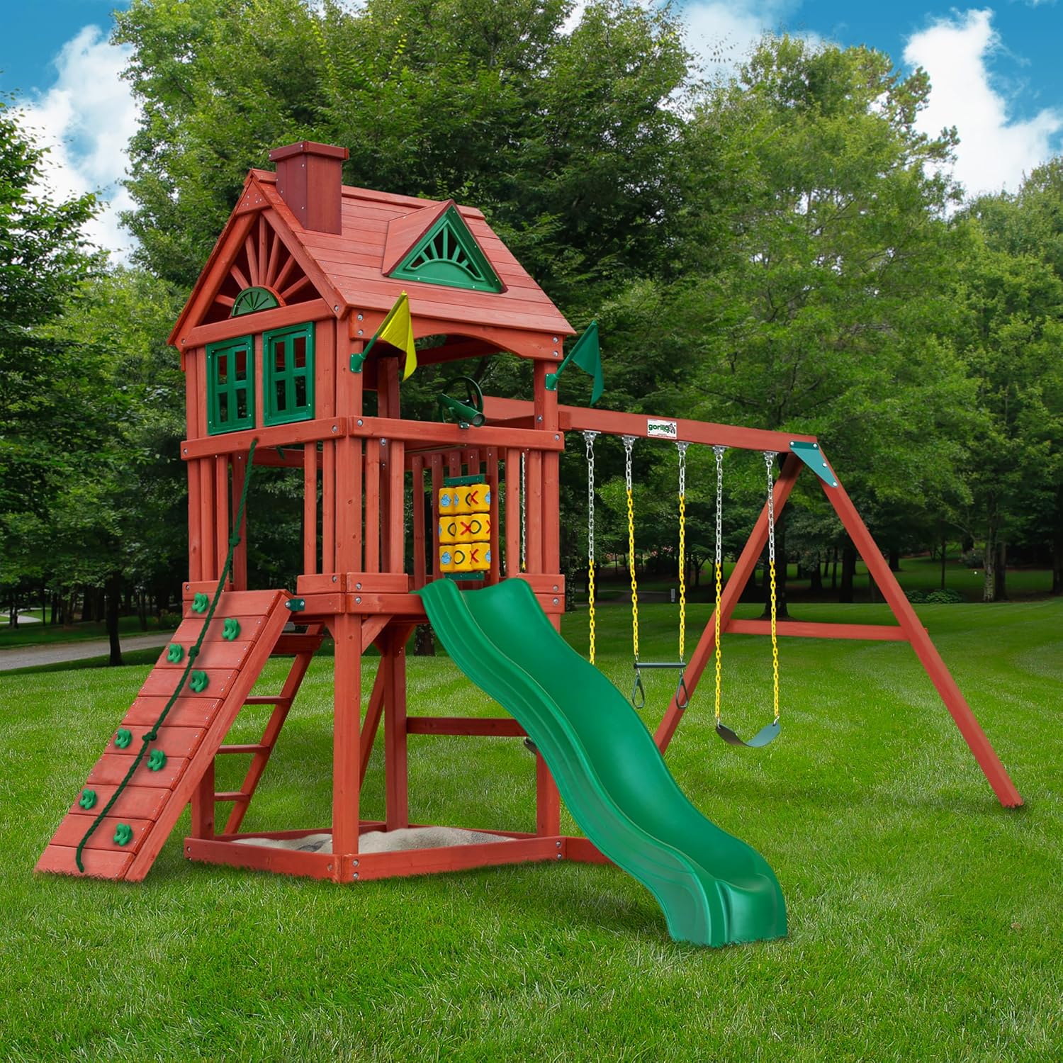 Gorilla Playsets Spring Creek Wooden Swing Set with Wood Roof, Slide, Swings, and Climbing Wall B0F4M8VQHM