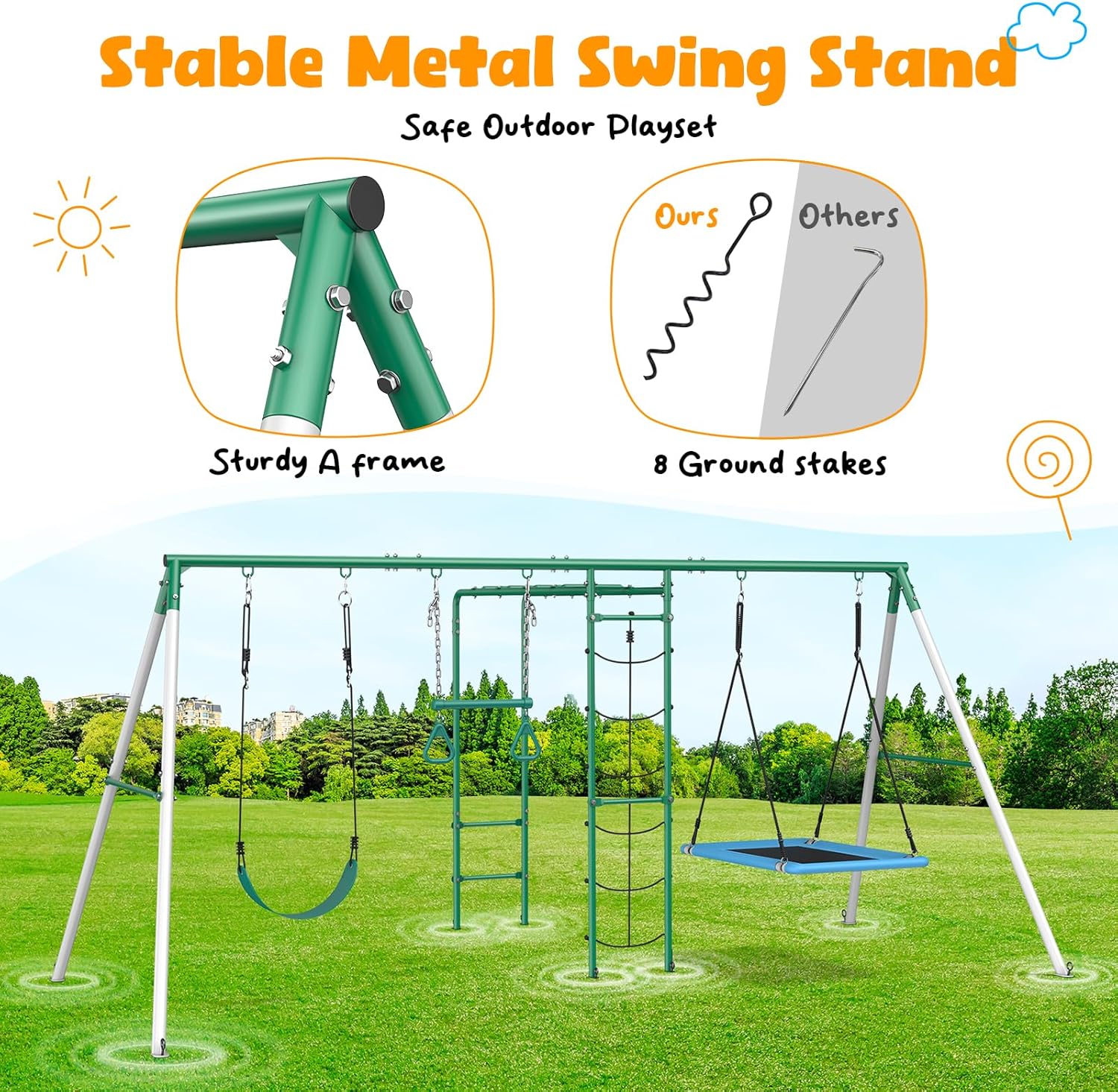 • 【Stable Jungle Gym】Made with high-quality steel and coated with powder finish, this playground sets for backyard is built to last. The sturdy A-frame construction and 8 ground stakes ensure that it remains solid and secure during playtime