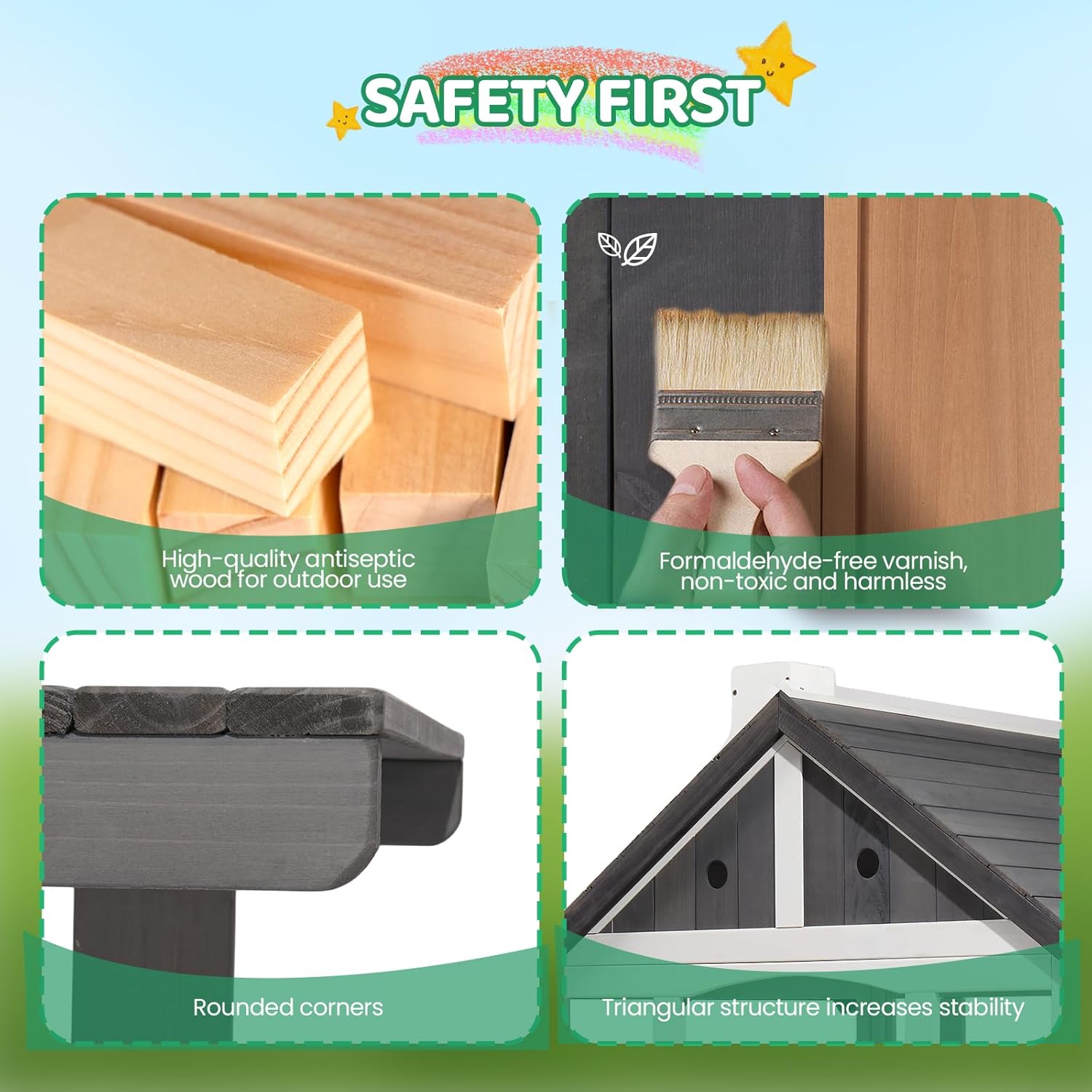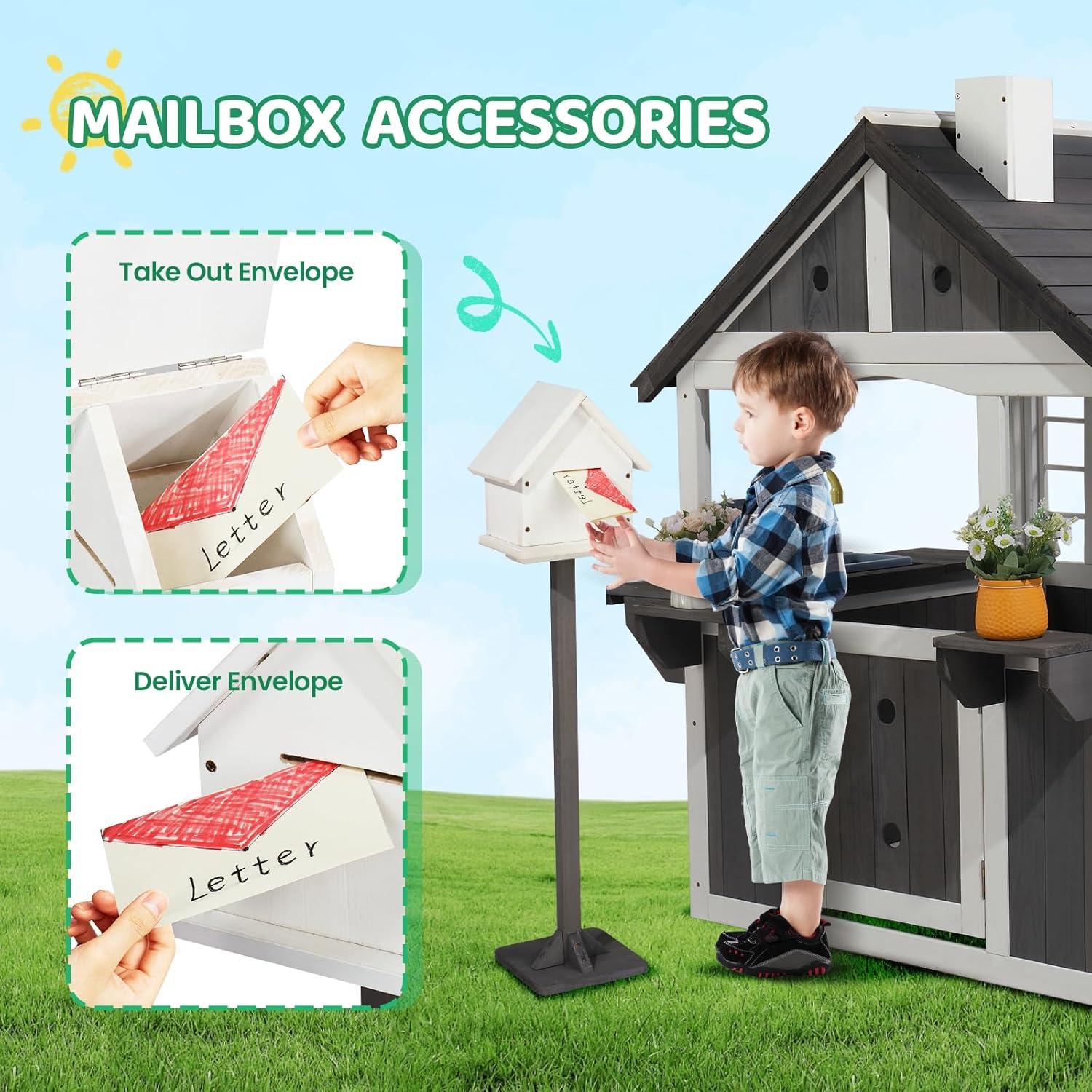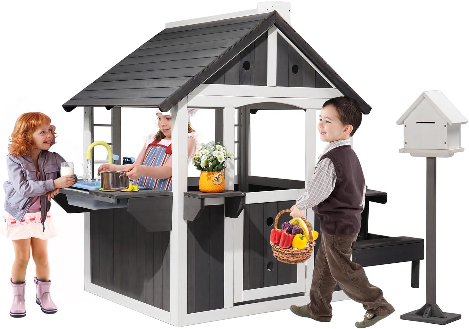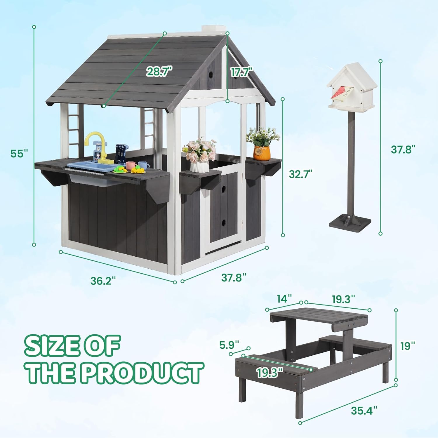 JOYMOR Kids Wooden Playhouse for Outdoor, Cottage with Sink, Picnic Table, Mailbox, Flowerpot Holders, Age 3-8 (Gray&White) B0F5PY2XWX