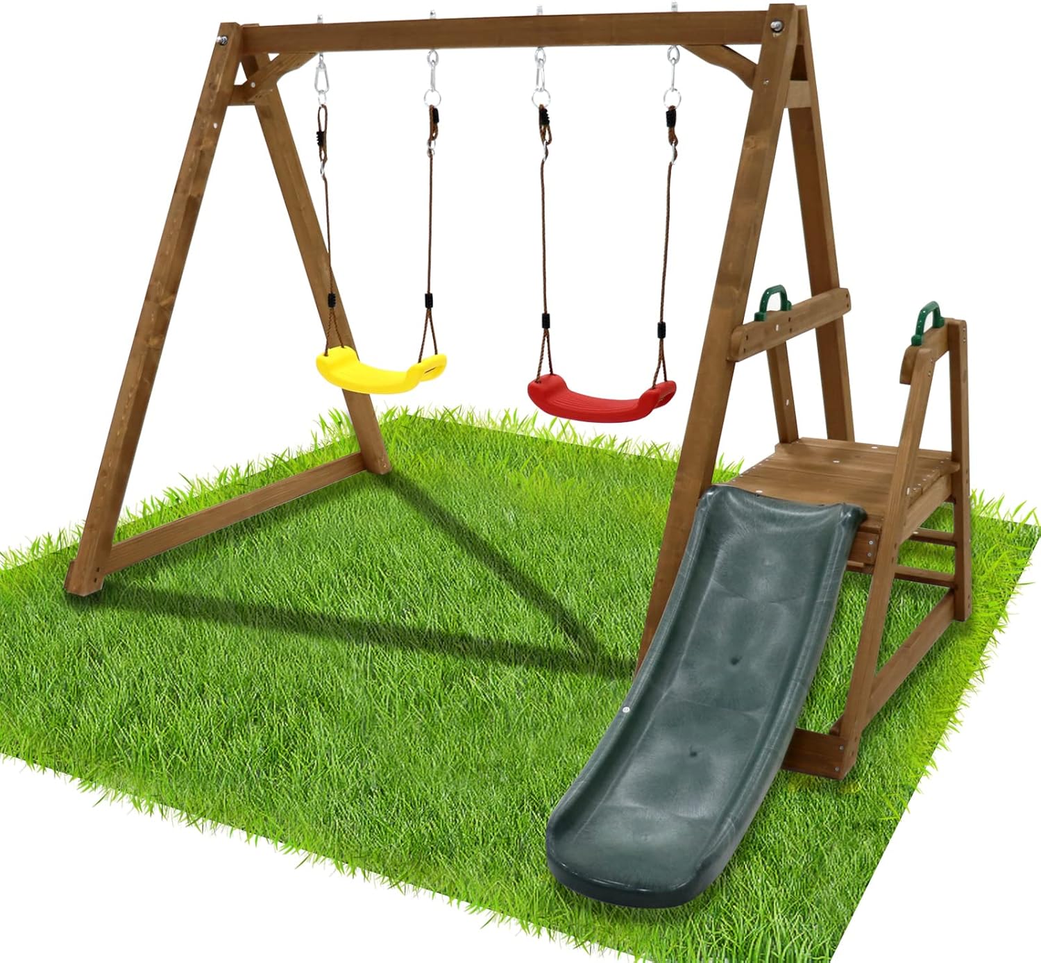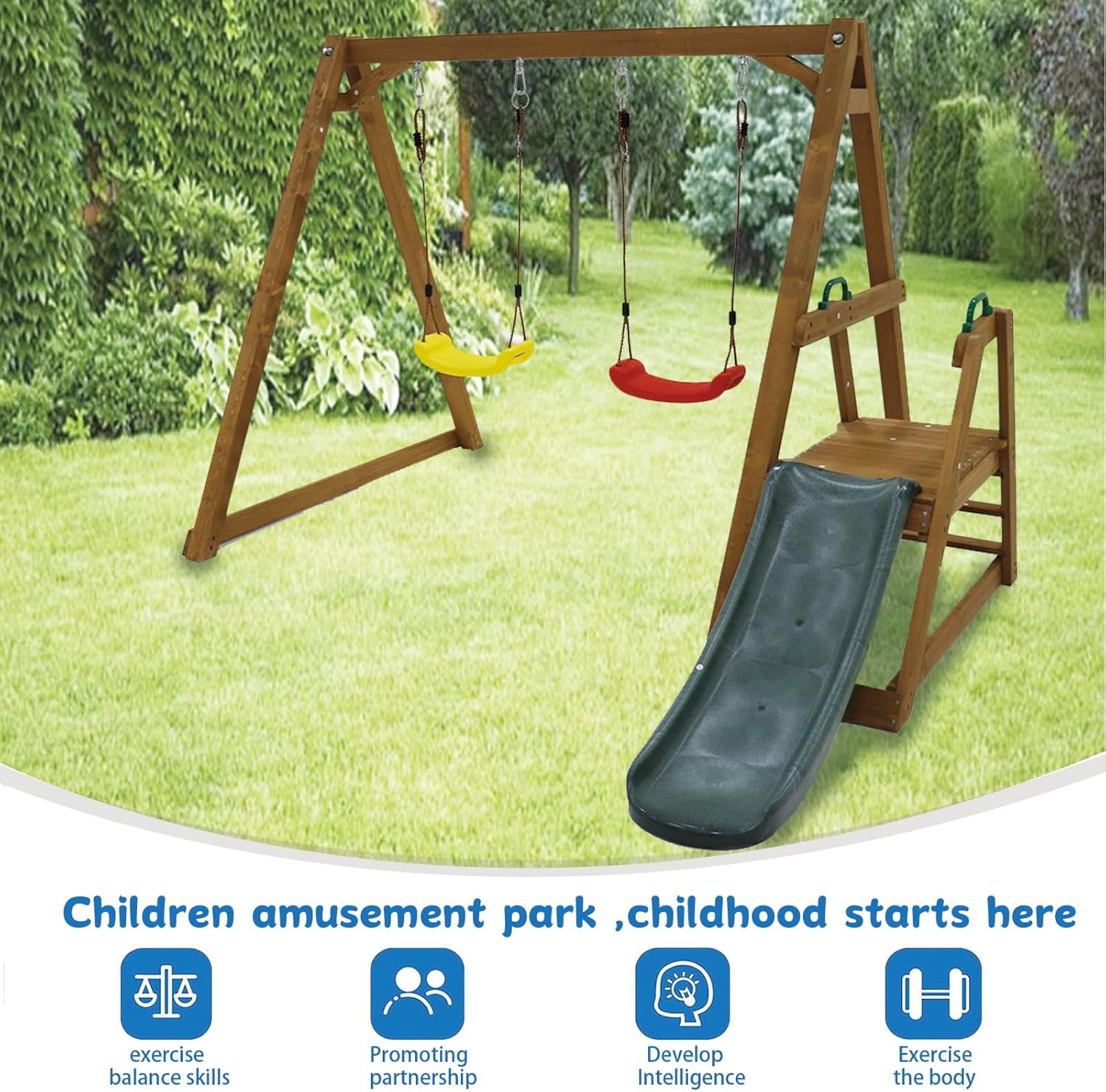 Kids Swing Set Outdoor and Slide – Sturdy Solid Wood Swing Frame with Climbing Ladder – Natural B0DJXX2GXR