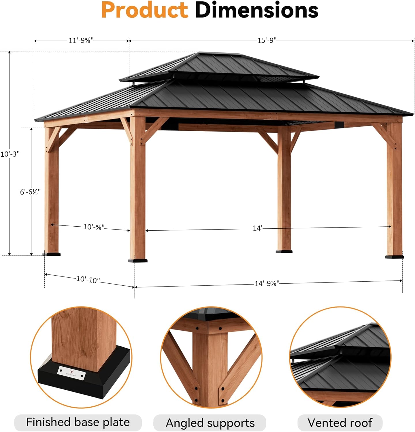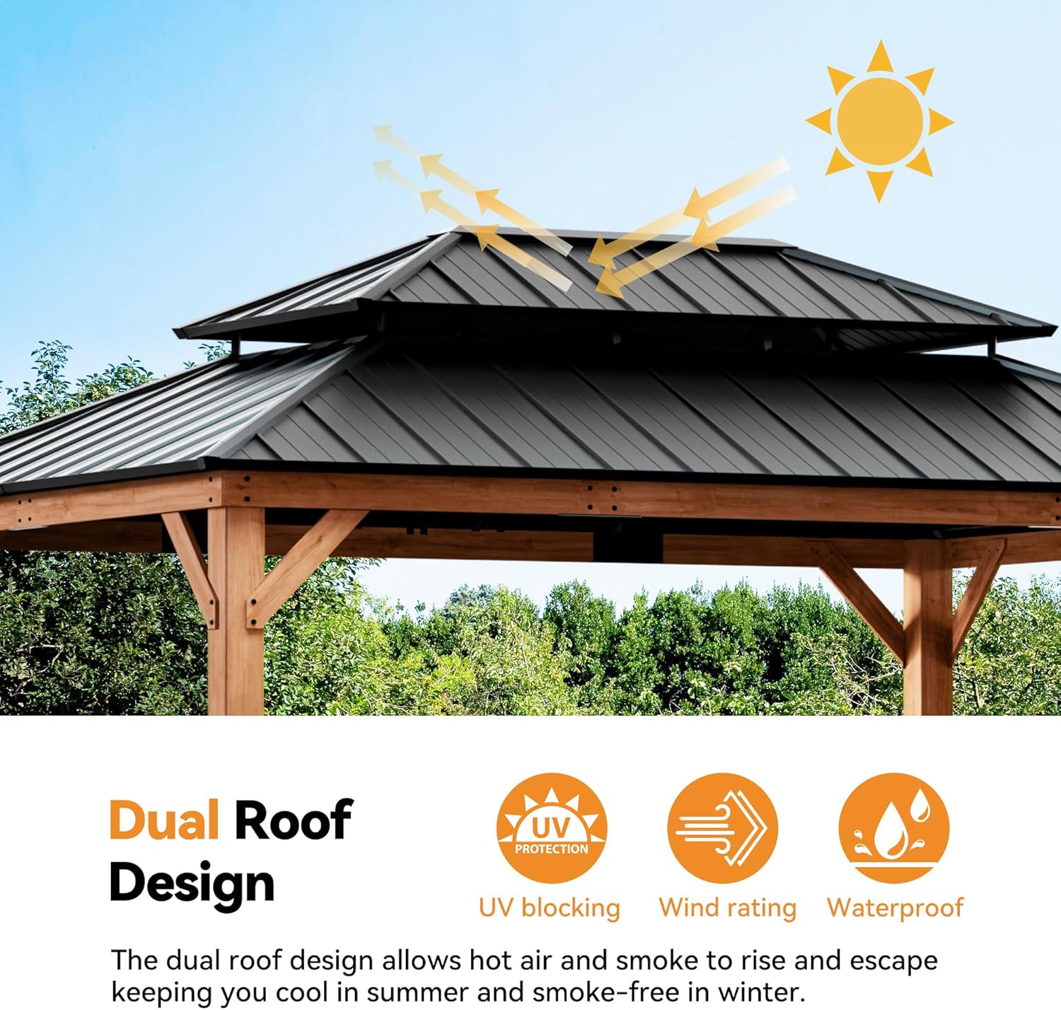 Modern Shade Rosewood Wood Gazebo 12′ x 16′, Cedar Framed Wooden Pavilion with Double Galvanized Steel Roof, Permanent Grill Gazebo with Sturdy Hooks for Garden, Backyard, Patio, and Deck B0DVPKQJMG