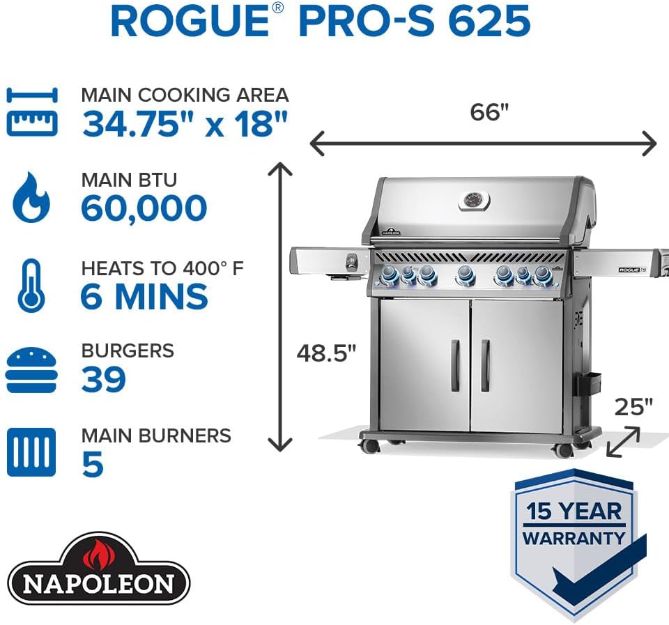 Napoleon Rogue PRO-S 625 Propane Gas Grill with Infrared Side and Rear Burners, Stainless Steel – 7 Burners B0DVM1Q53F