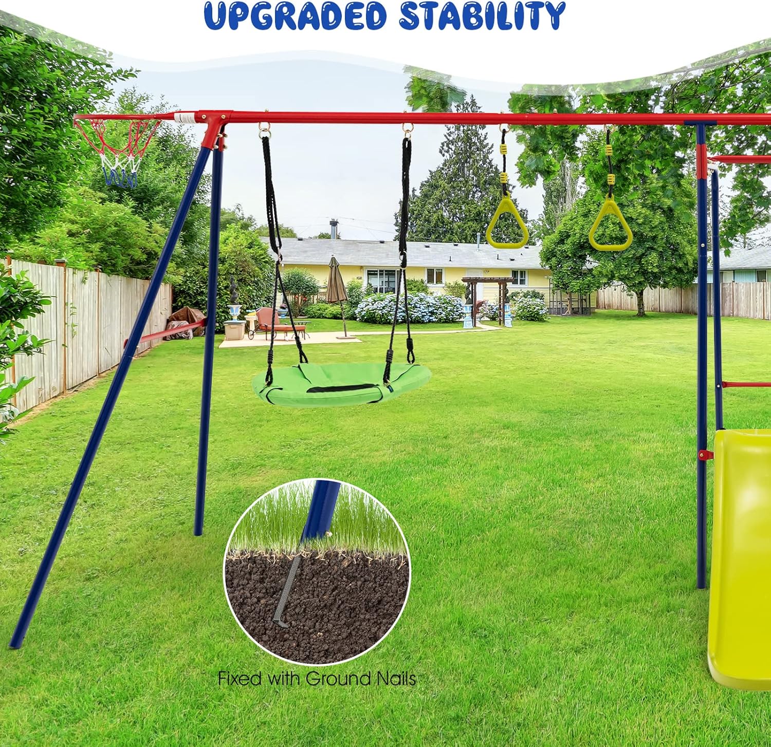 6 in 1 Multifunction Kids Swing Set for Backyard, Heavy-Duty A-Frame Metal Stand with 3 Adjustable Swing Climbing, Net, Trampoline, Basketball Hoop B0DY14XHHF