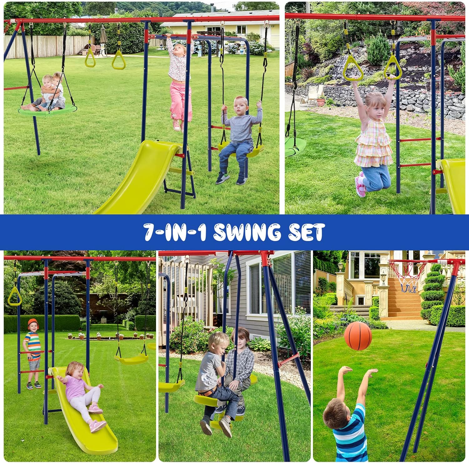 OLAKIDS Swing Sets for Backyard, 7 in 1 Outdoor 660LBS A-Frame Heavy Duty Metal Swing Stand with Monkey Bar for Kids, Playground Playset with Slide, 2 Swings, Glider, Trapeze Rings, Basketball Hoop B0BHHSPNFZ