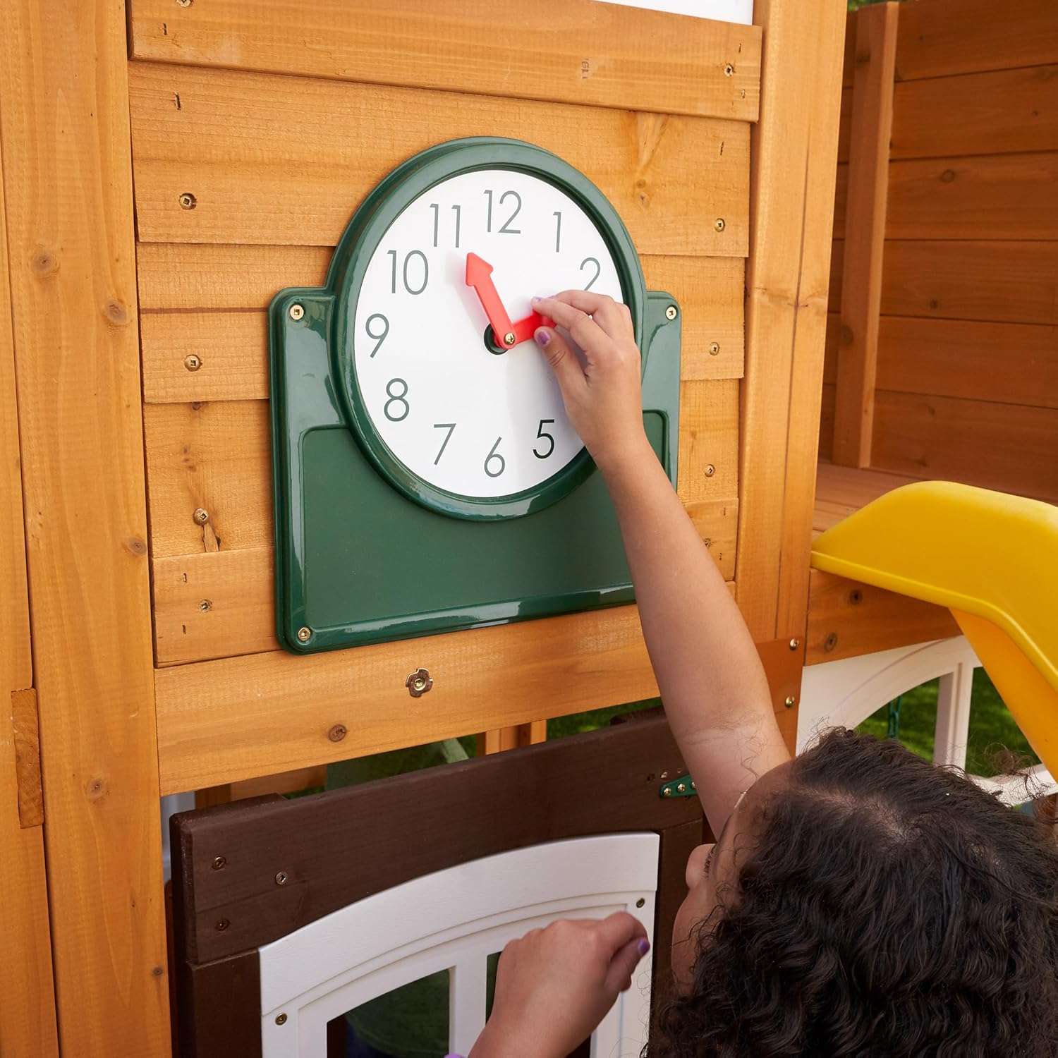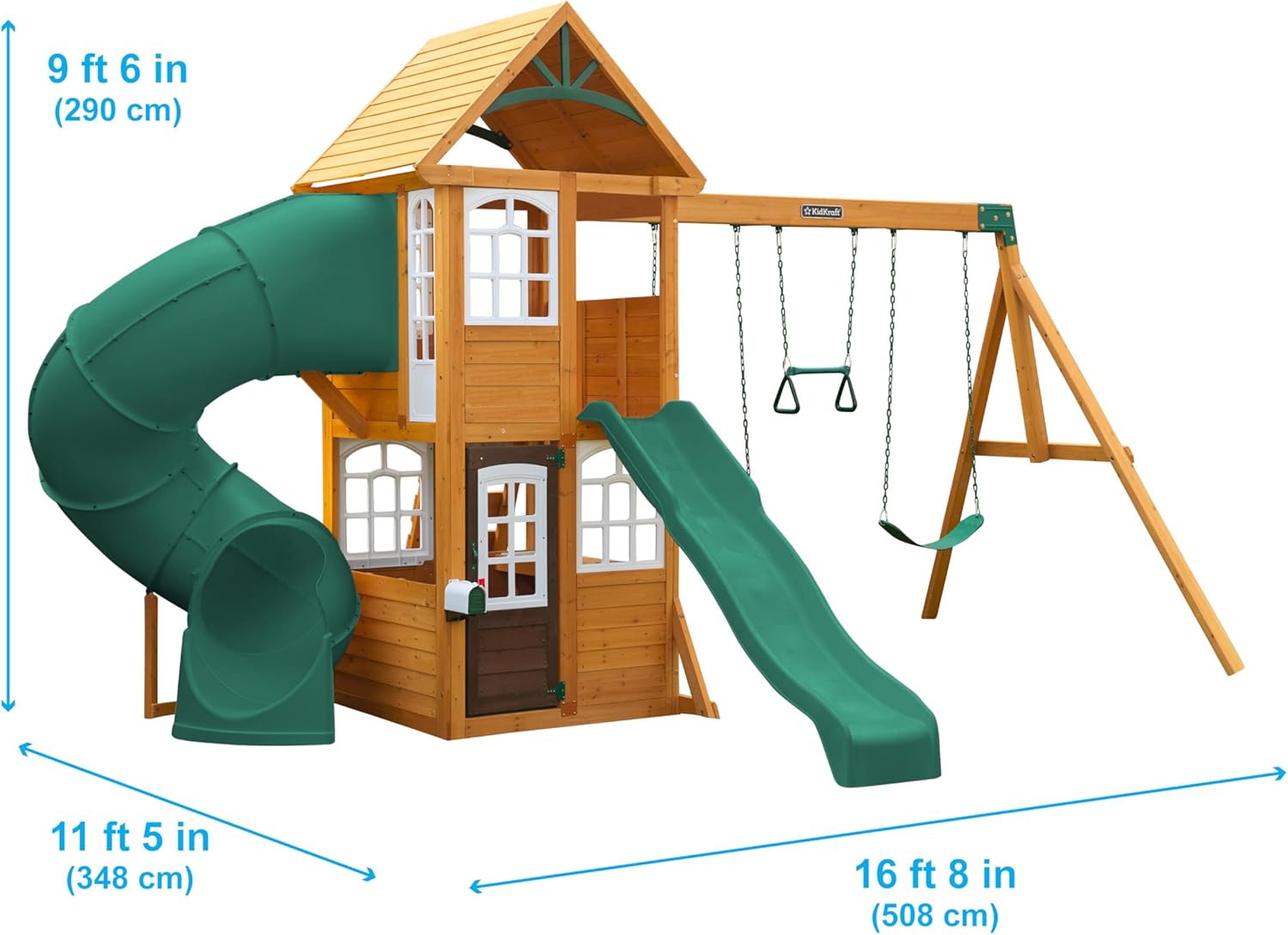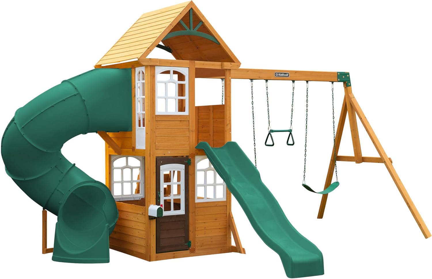 Two level wooden clubhouse with shiplap roof and windows with decorative plastic frames Play kitchen including stove with knobs that turn and fire-inspired graphics, a sink and three utensils Twist n’ ride tube slide offers a thrilling ride while the high rail wave slide offers a safe, secure ride 2 belt swings and 1 acrobar […]