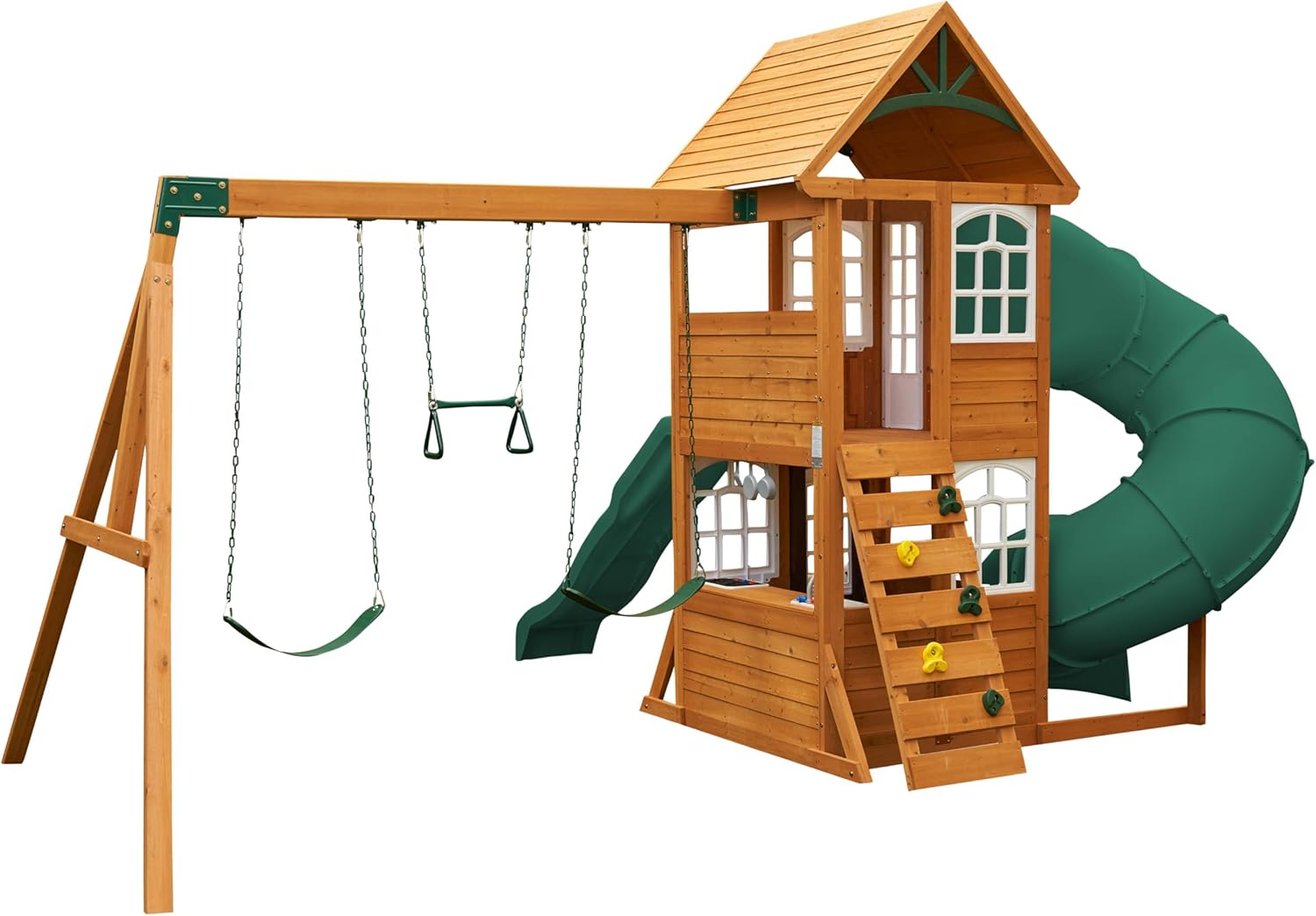 Atlantis Cedar Wood Swing Set with Wave Slide, Raised Clubhouse, Rock Wall, Belt Swings, Trapeze, Balcony, Lower Play Space, Snack Bar, Sandbox Area, Step Ladder, Outdoor Playset B073D66GQV
