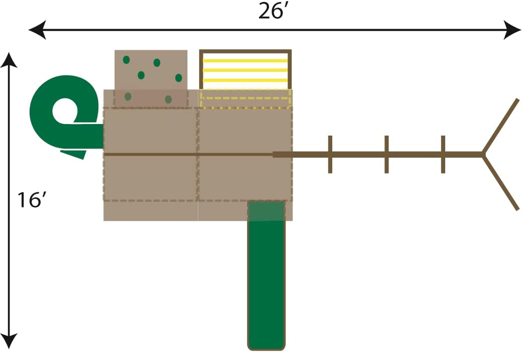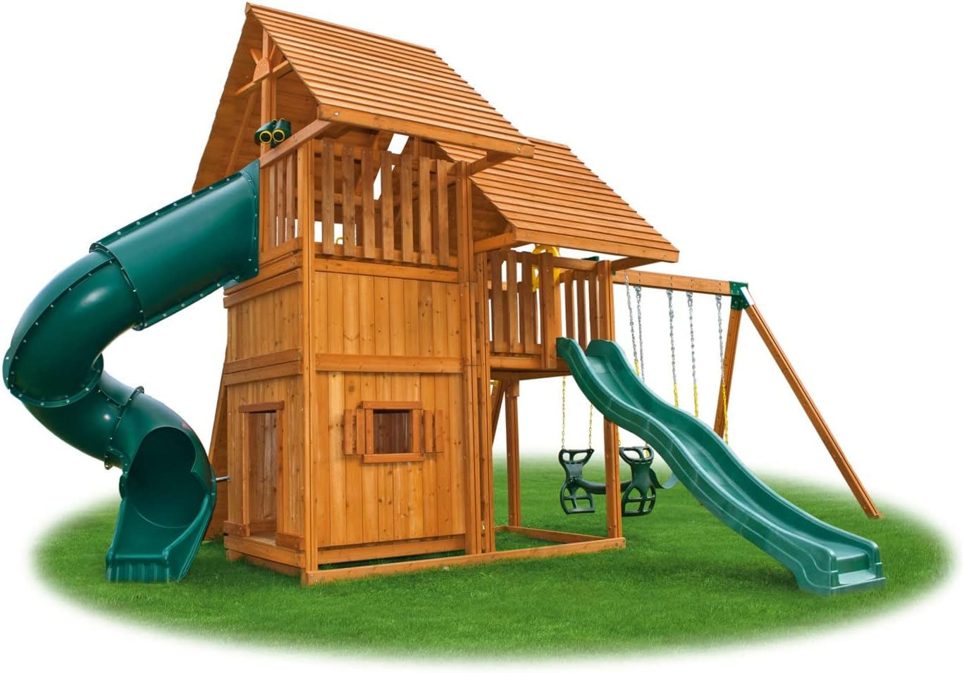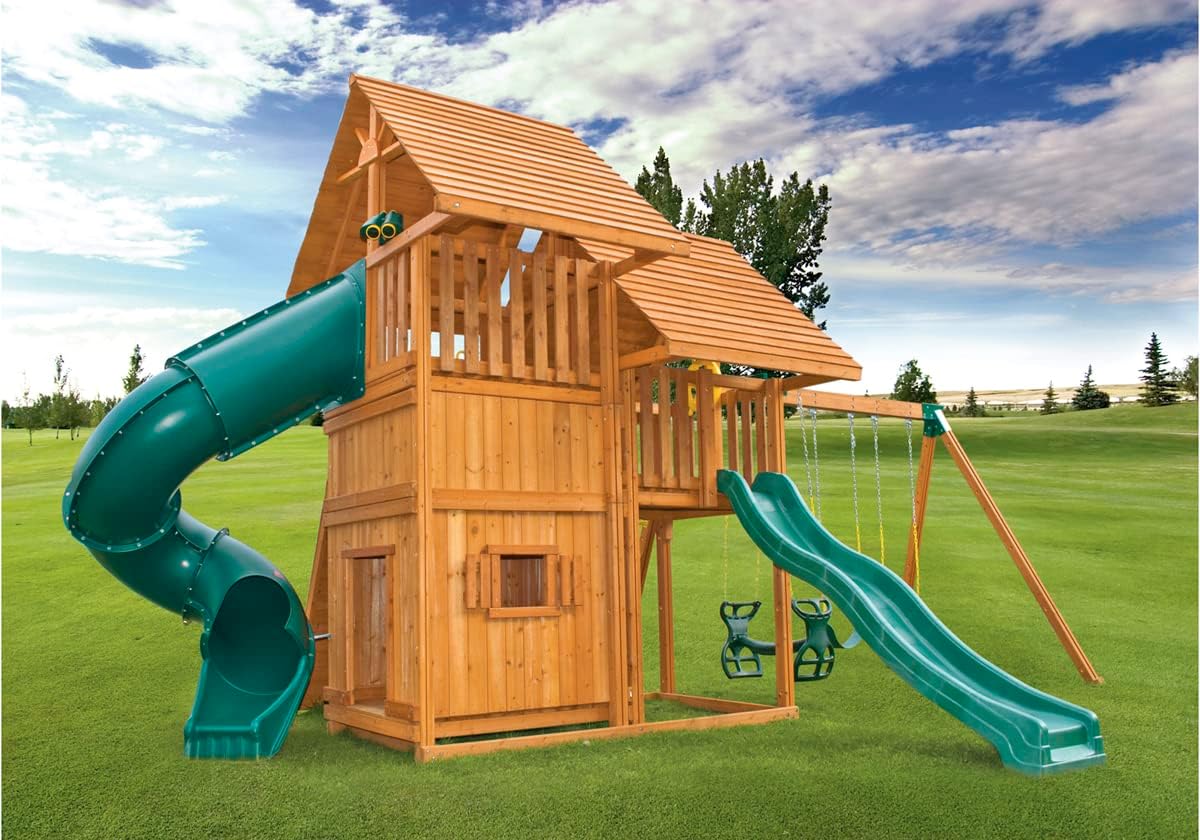 • What Is Included – This wooden swing set is the only one of its kind and includes two clubhouses with wood roofs, 10′ green wave slide, 7′ rock wall, 7′ green spiral slide, extra wide rung access ladder, bottom clubhouse, horse glider swing, two sling swings, play wheel and play jumbo binoculars – BYO Friends! Everything that you would need to install a huge 26’ x 16’ backyard swing set.