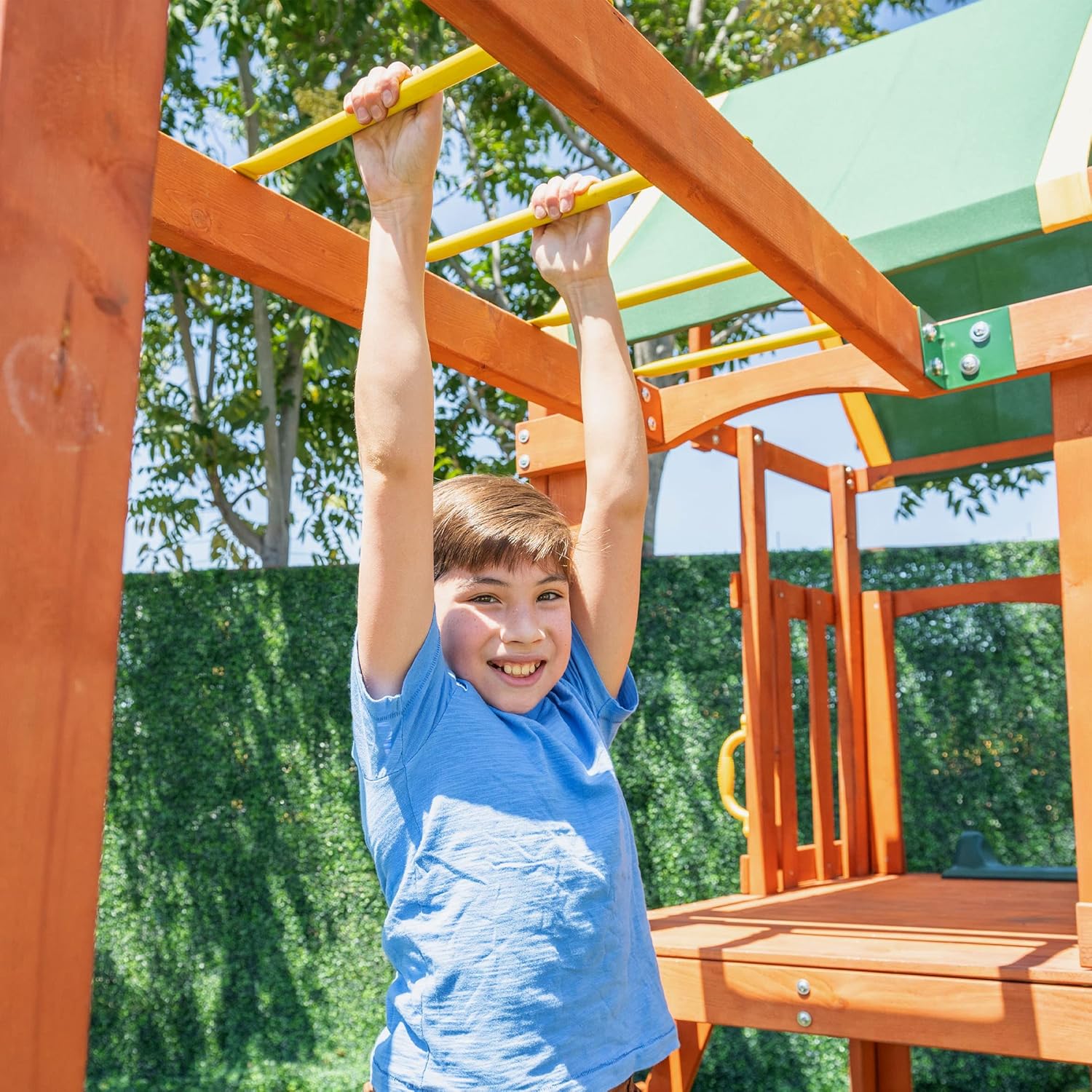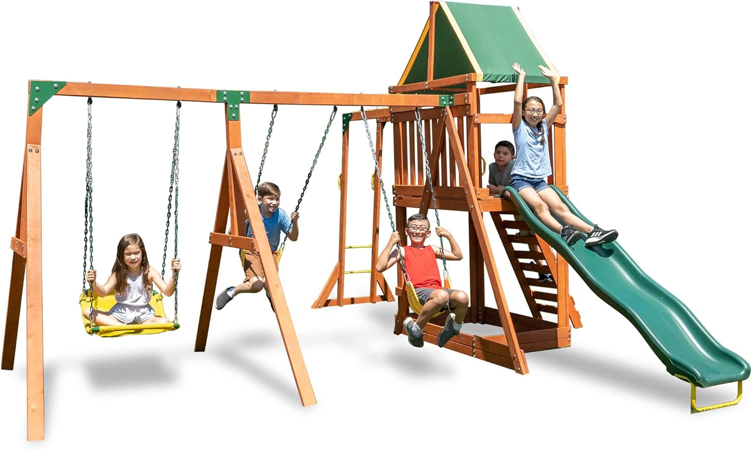 Sportspower Amazon Exclusive Olympia Wood Swing Set with 3 Swings, Slide, and Monkey Bars, Natural/Green with 8′ Slide B08DL4F776