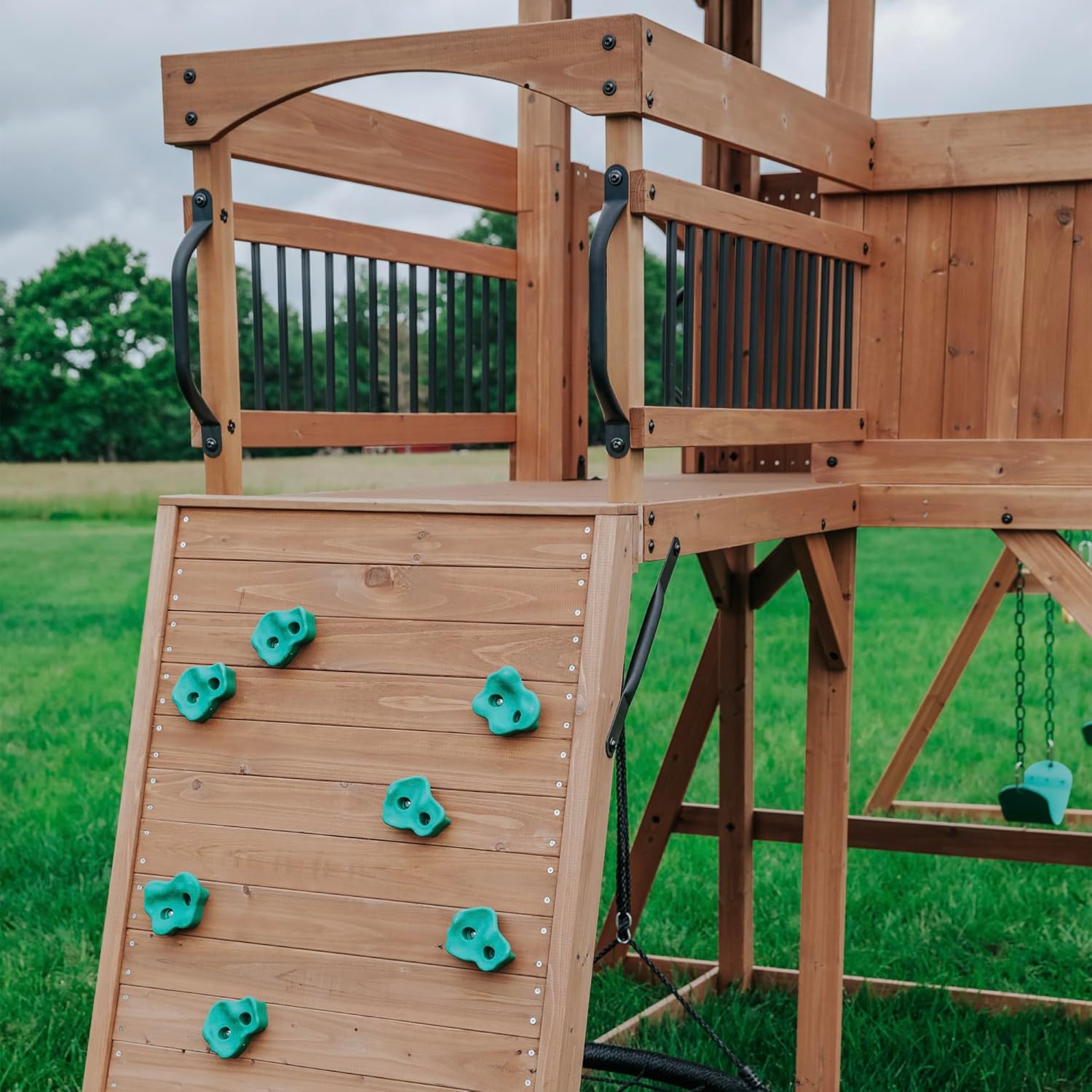 Sterling Point Cedar Wood Swing Set with Wave Slide, Raised Clubhouse, Wooden Bridge, Rock Wall, Belt Swings, Web Swing, Trapeze, Balcony, Climbing Wall, Ladder, Outdoor Playset B0C9KZSJS5