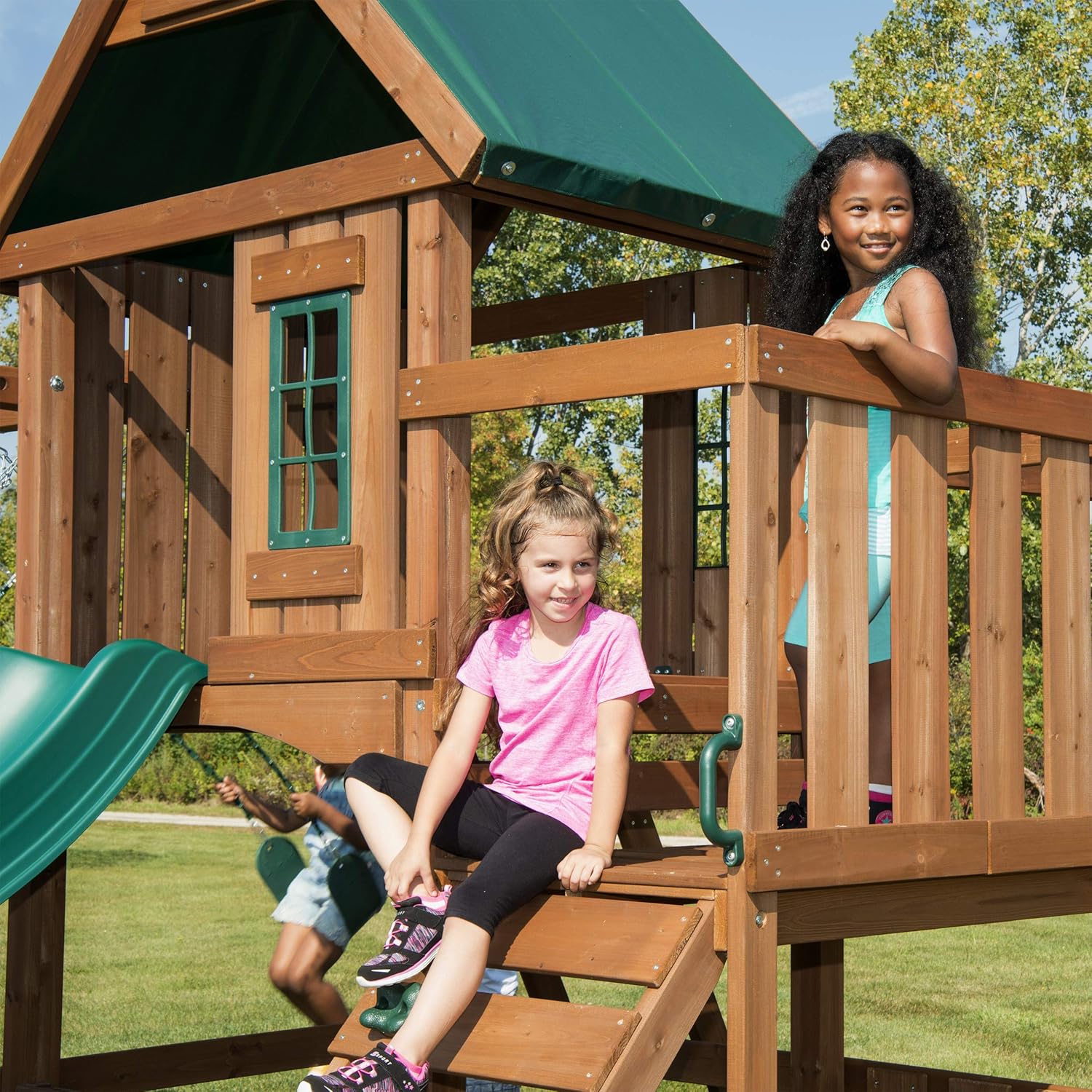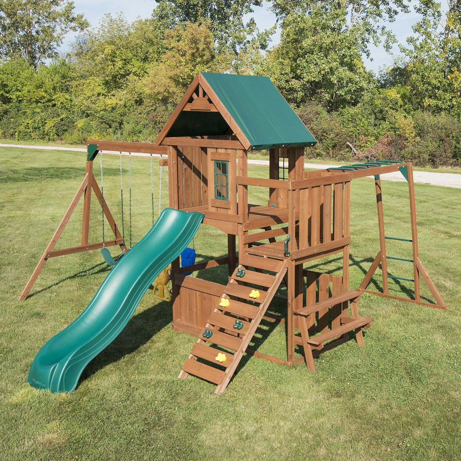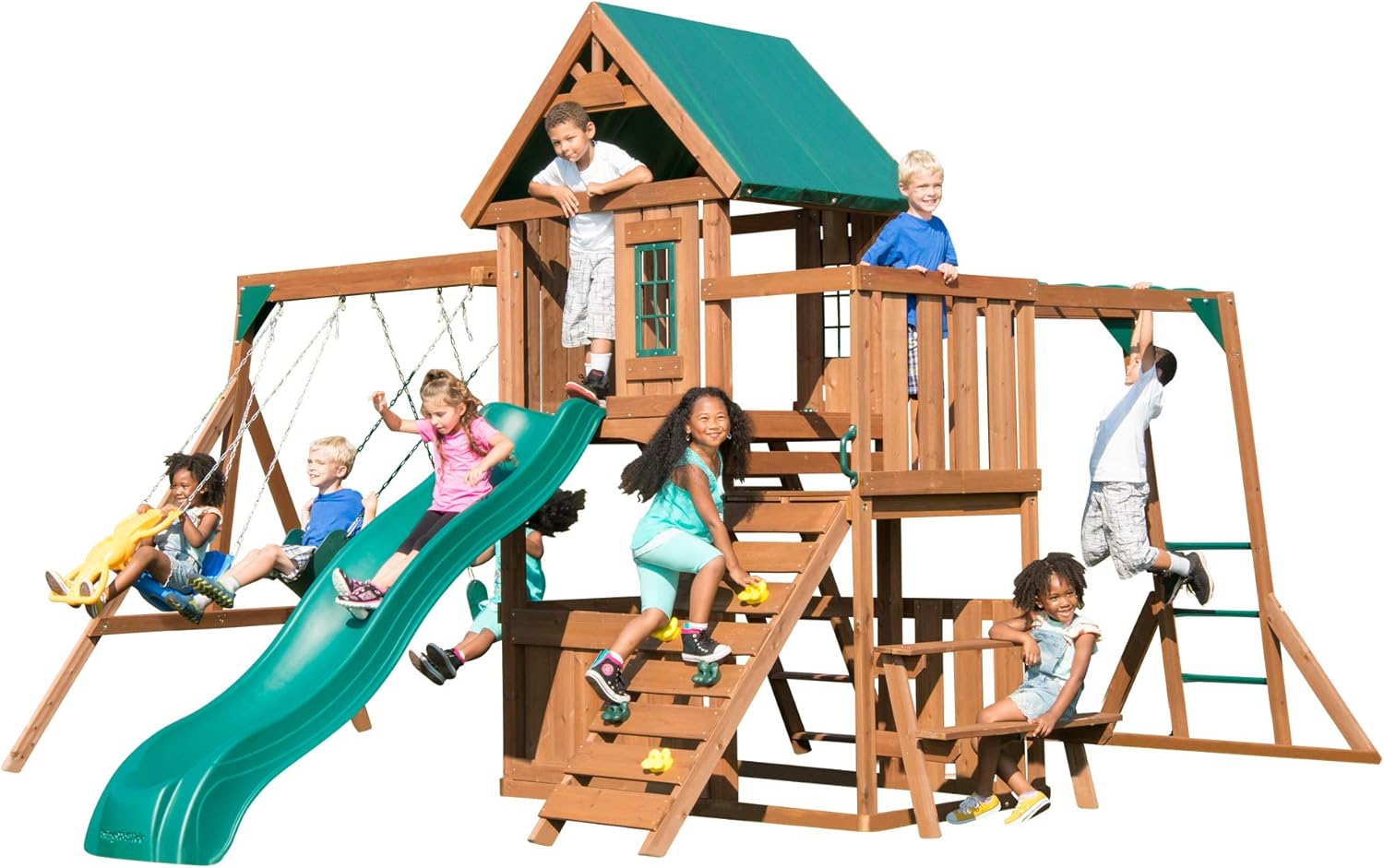 Swing-N-Slide Fremont Wooden Swing Set with Slide, Glider, Swings, Monkey Bars, Climbing Wall and Picnic Table, Wood, Green B0DJHHS158