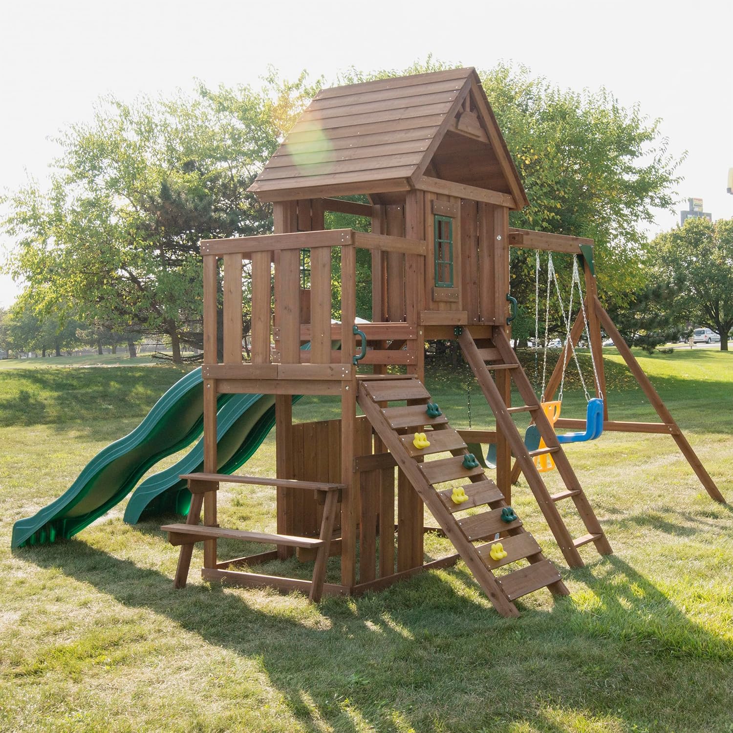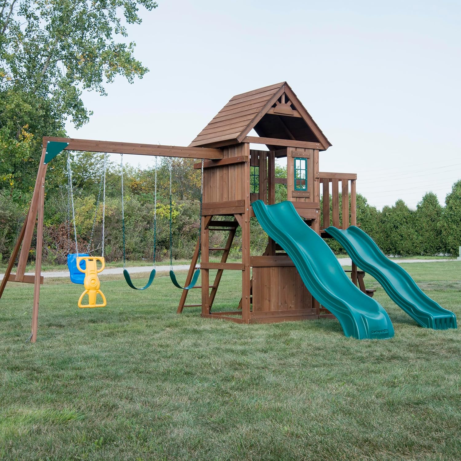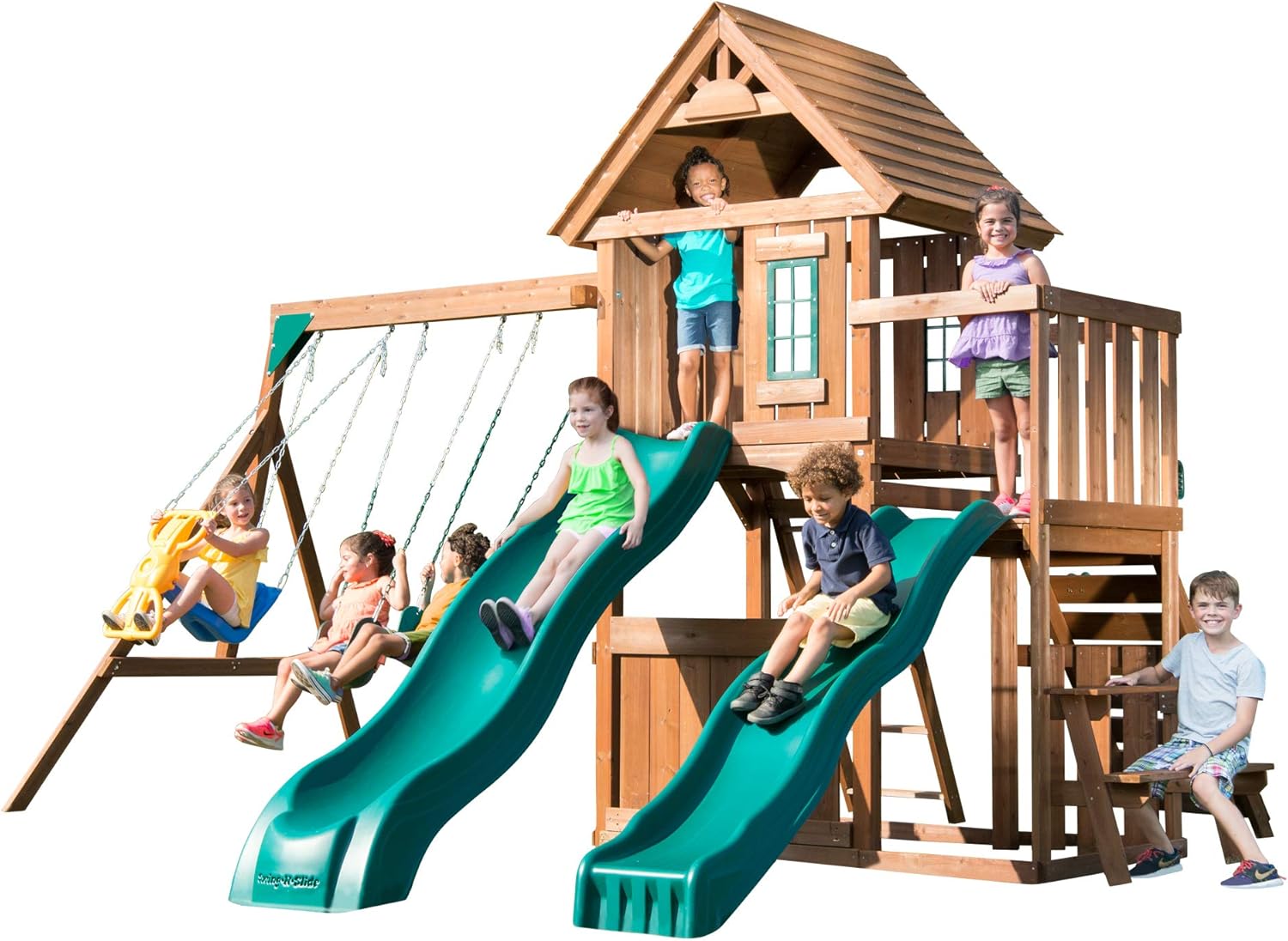 Swing-N-Slide Lookout Mountain Wooden Swing Set with Two Slides, Climbing Wall, Swings, Glider & Picnic Table, Wood B0DJHHJ3LJ