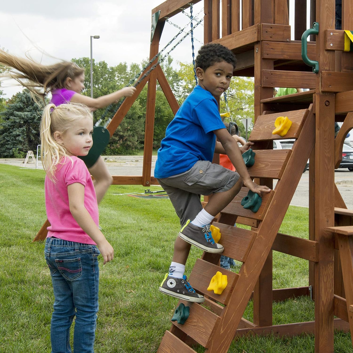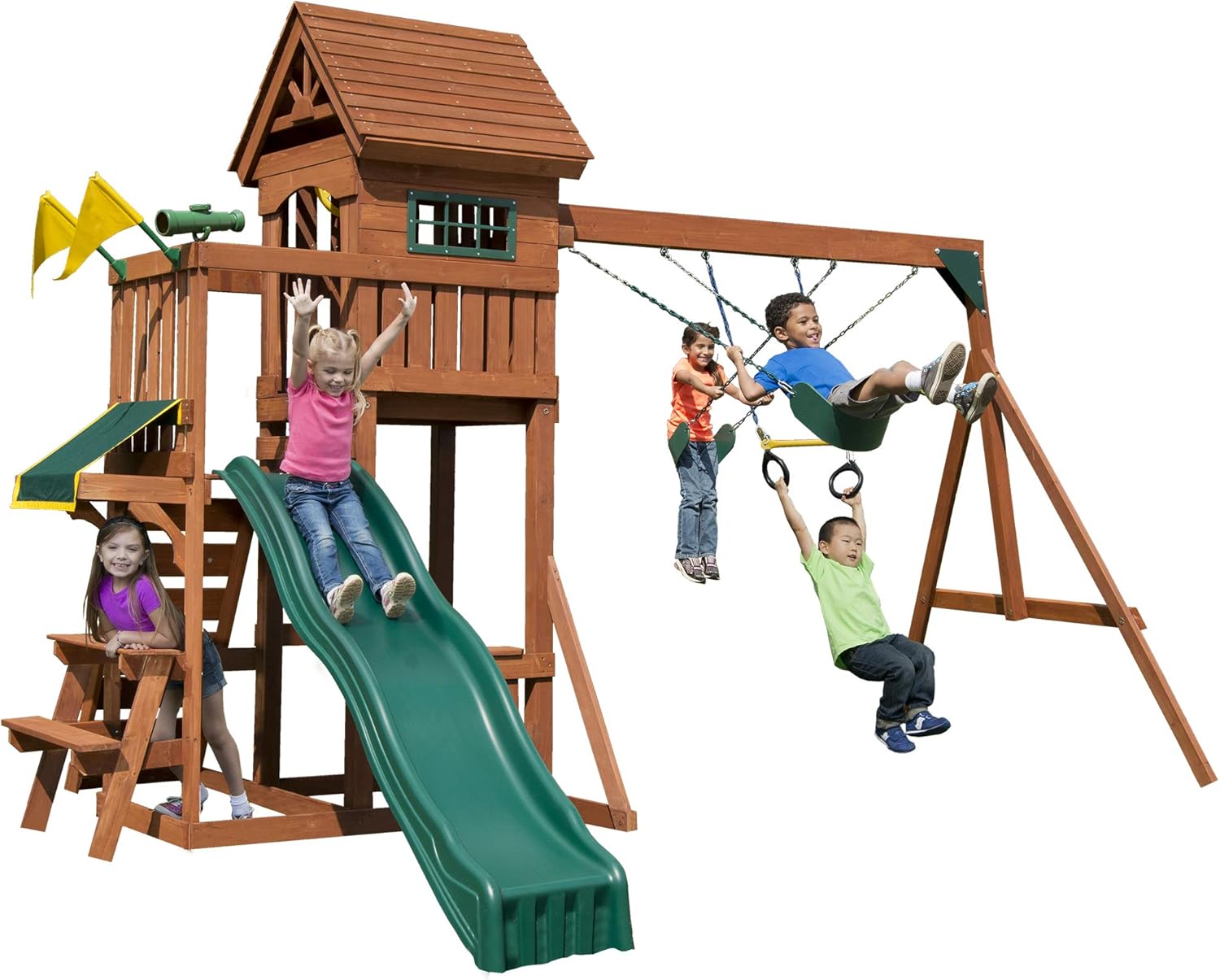 Swing-N-Slide PB- 8331 Playful Palace Swing Set with Slide, Swings, Wood Roof, Picnic Table & Climbing Wall, Wood, Green B07MVTXTGT