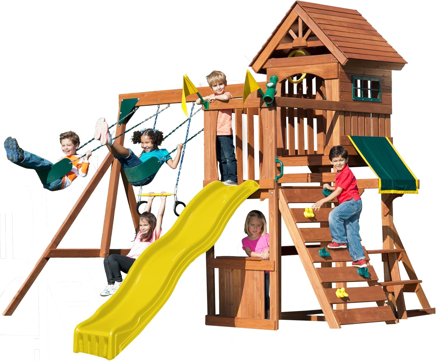 Atlantis Cedar Wood Swing Set with Wave Slide, Raised Clubhouse, Rock Wall, Belt Swings, Trapeze, Balcony, Lower Play Space, Snack Bar, Sandbox Area, Step Ladder, Outdoor Playset B073D66GQV