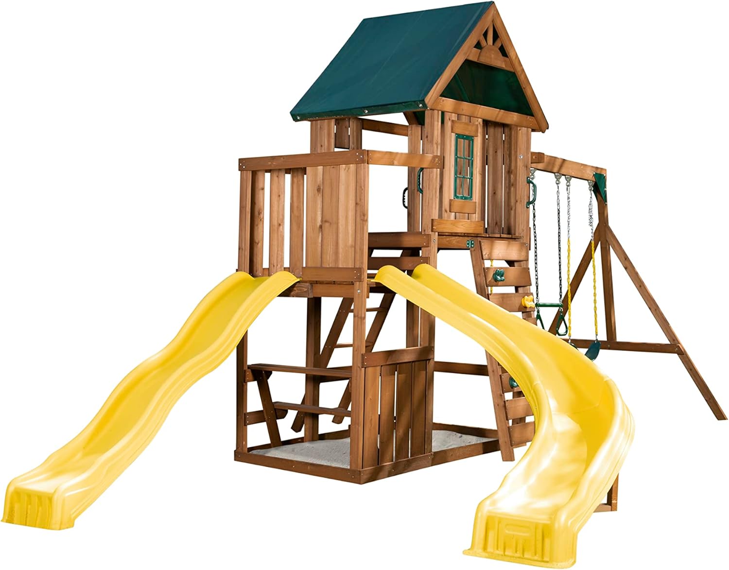 Measures 21’4″l x 11’9″w x 10’3″h when fully assembled Includes all Wood, hardware, and fully illustrated instructions needed to assemble play set Features two slides backed by a lifetime Warranty against cracks and breaks Heavy duty swings support up to 250 pounds Architectural roof with sunburst gable and heavy duty green canopy roof