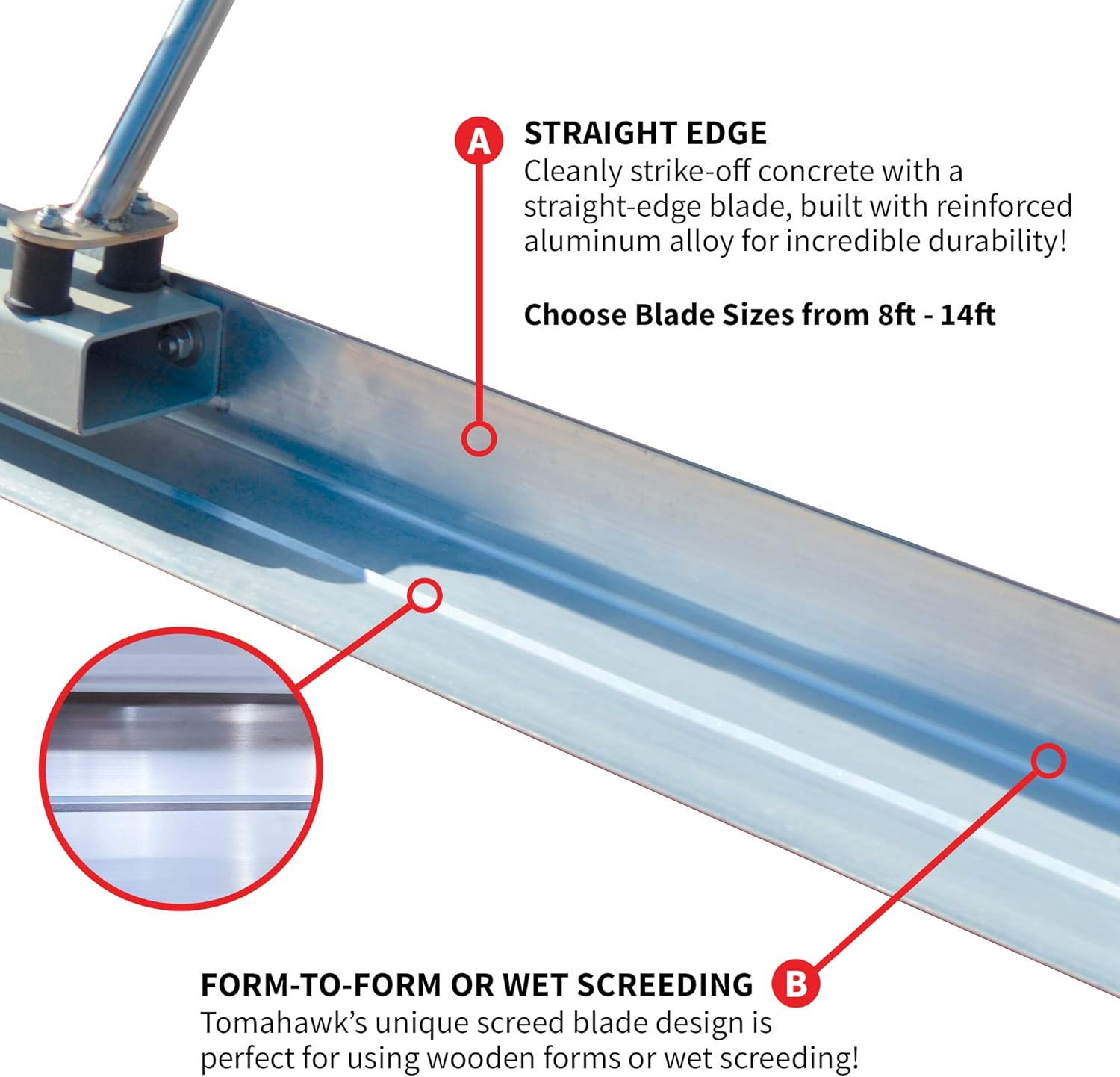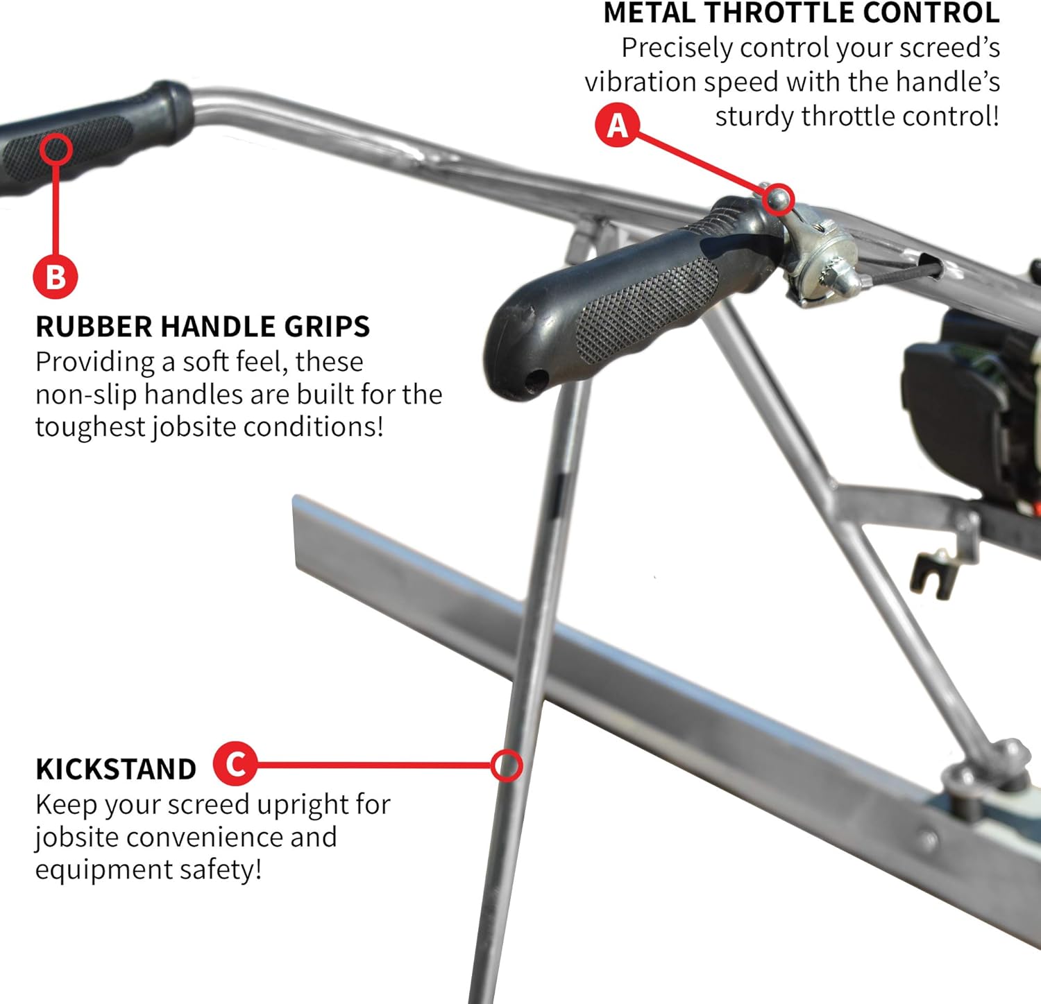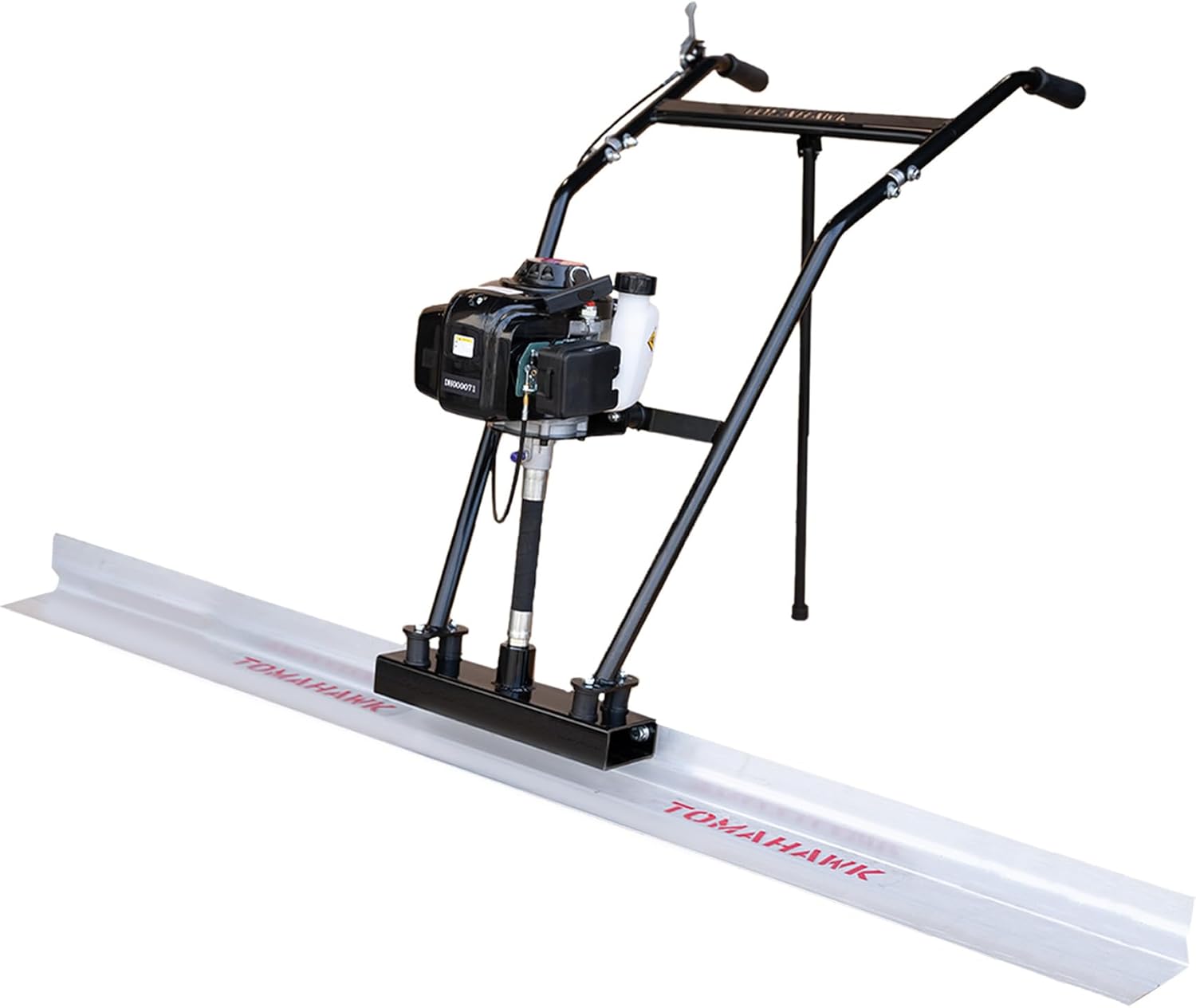 • 37.7cc gas power screed for concrete finishing with 4-Stroke Tomahawk gasoline engine for 7000 VPM uniform vibration over the length of the blade with near concrete bull float finishing results