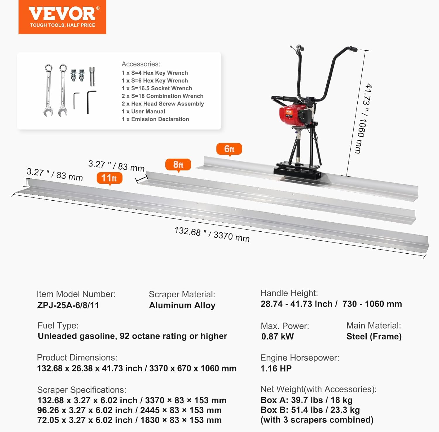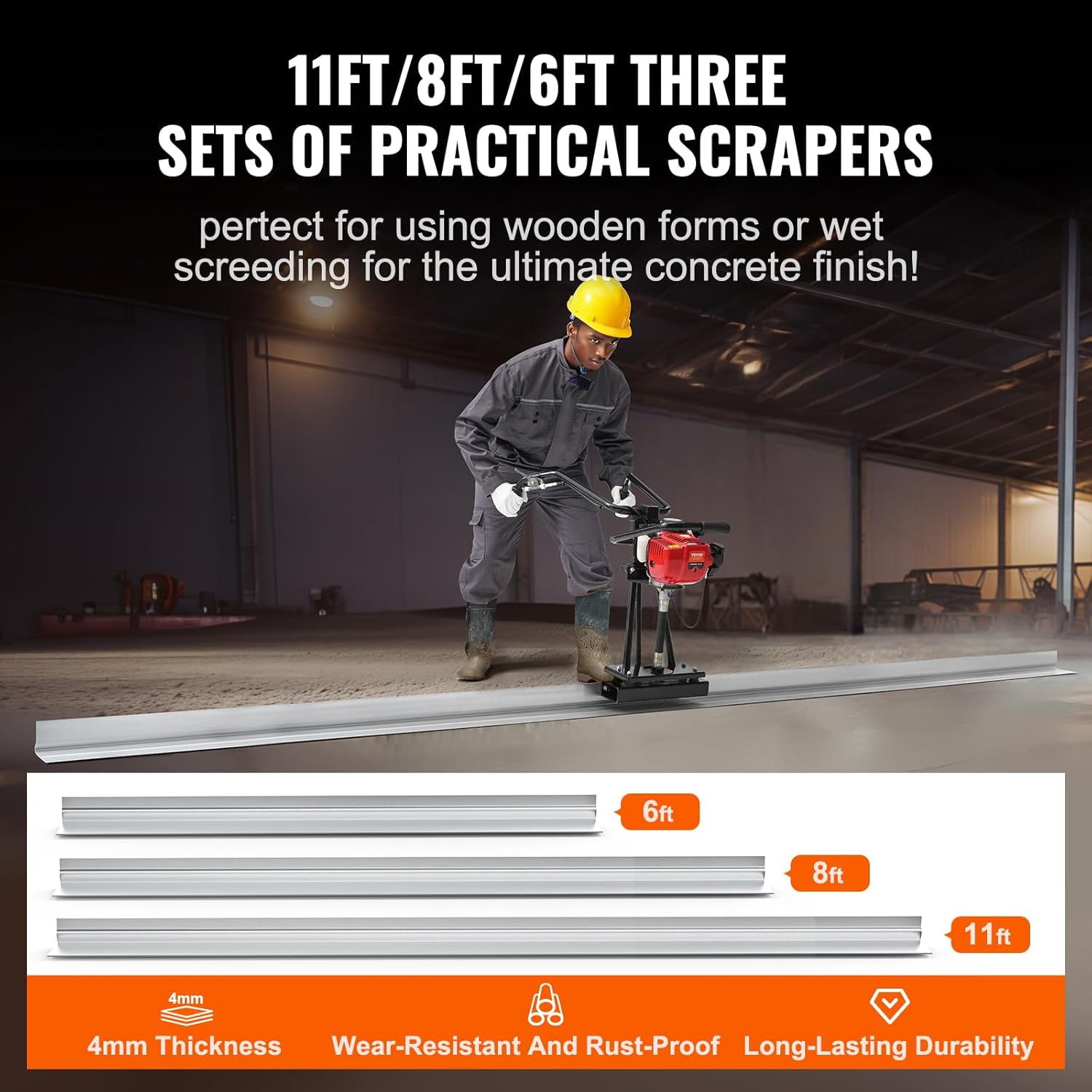 VEVOR Concrete Power Screed, 6ft/8ft/11ft Aluminum Board Straight Edge Bar Set, 4 Stroke Cement Finishing Vibrating Motor w/Height Adjustable Handles, High Efficient Concrete Tool 6500RPM B0D9V844H6