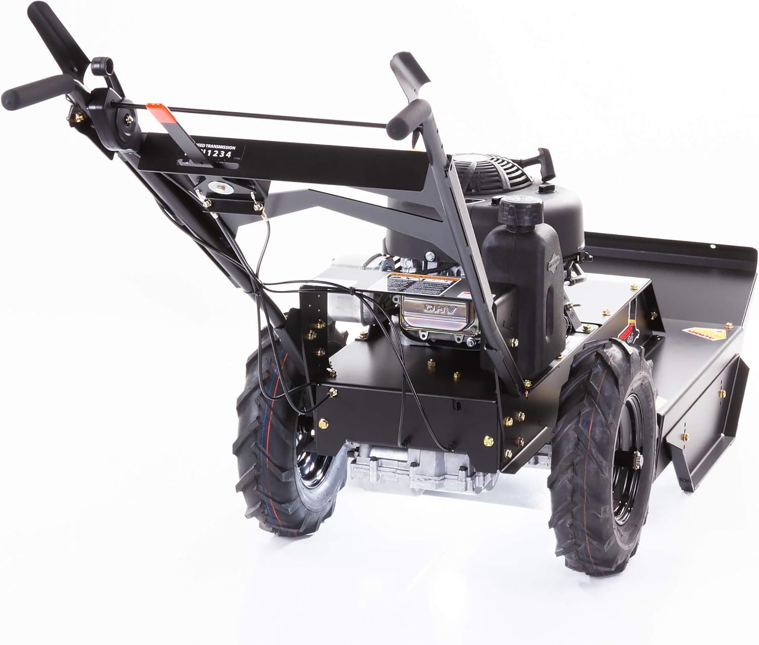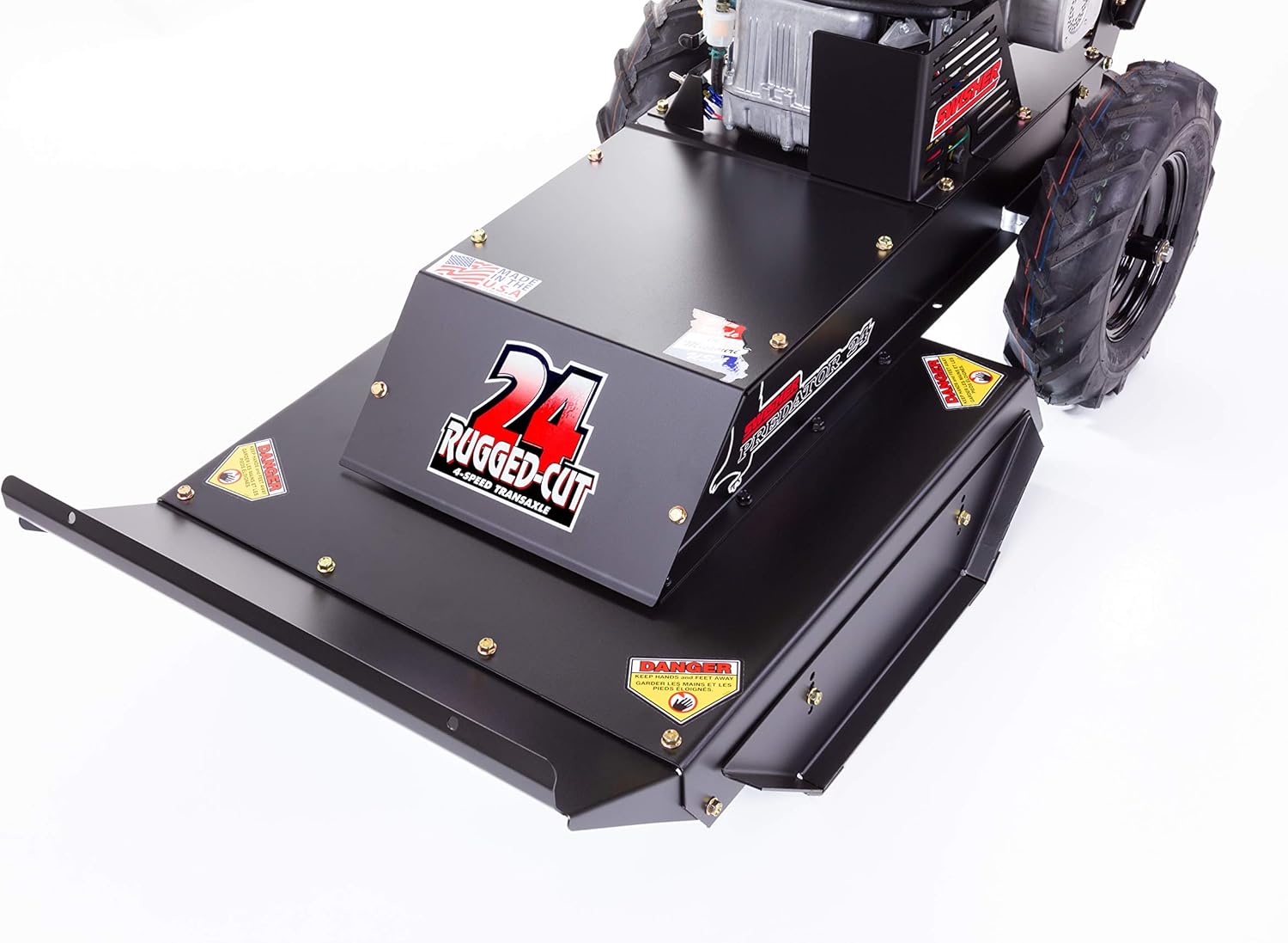 Improved gear shift access located on the handlebars for better operator control 11.5 HP (344cc) Briggs and Stratton recoil start engine 24 in. self-propelled walk-behind rough cut mower Single fixed hardened steel, rough cut blade Cutting height range of 3-4.75 in. 4-Speed transmission with reverse Front safety deflectors and wire shield