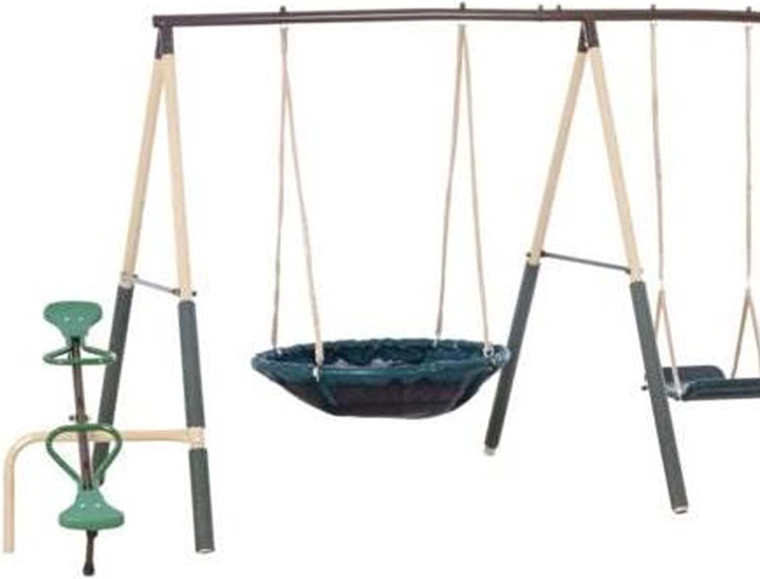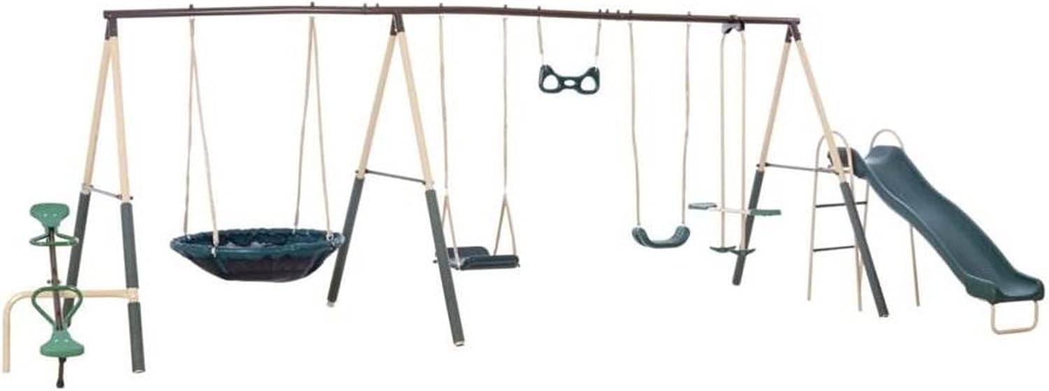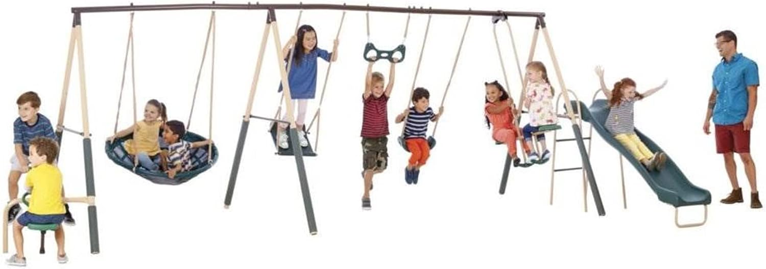 XDP Recreation Deerfield Outdoor Playground Swing Set with Slide, See Saw, Trapeze Swing, Fun-Glidr, Swing Seat, and Stand N Swing B07FN4B192